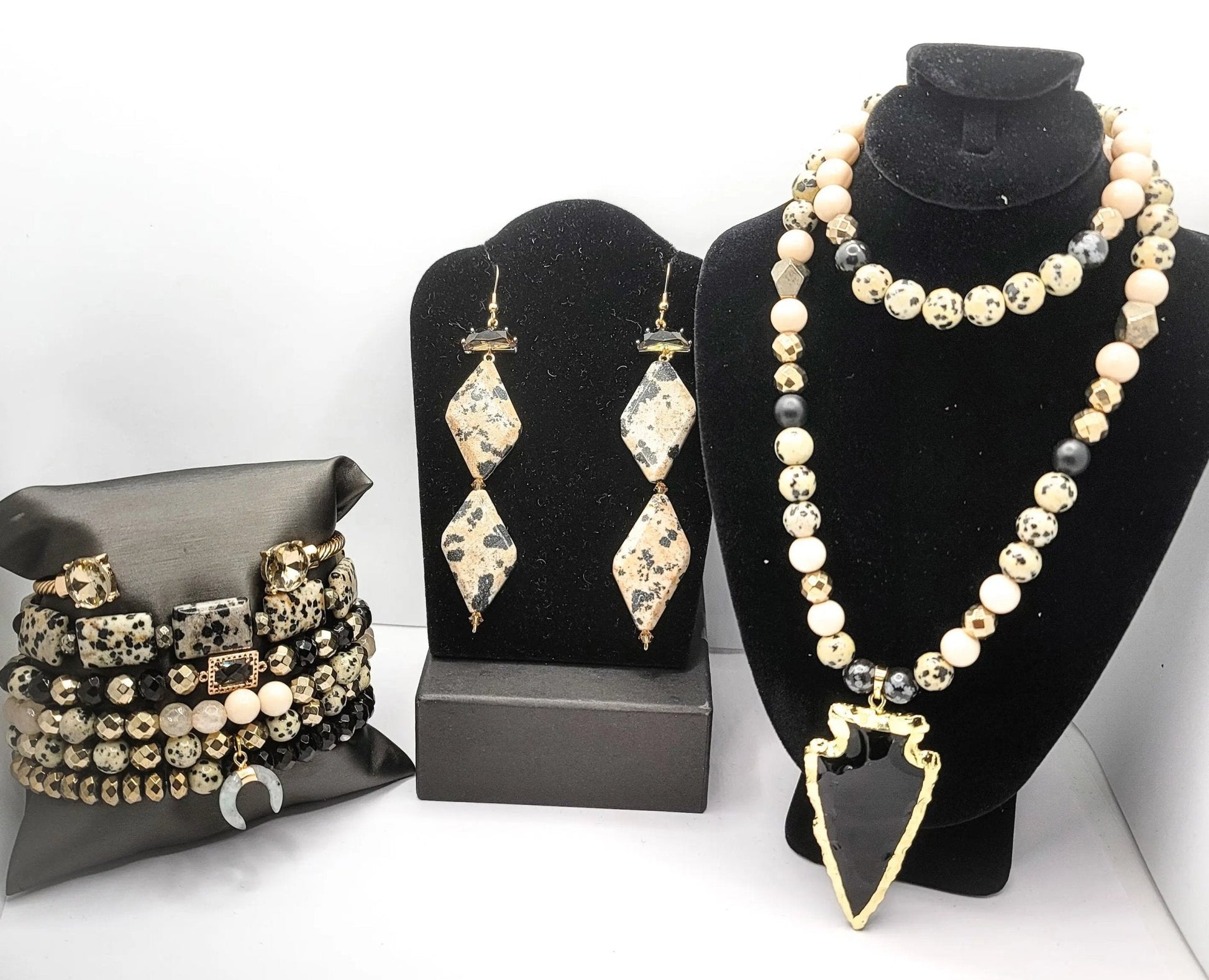 Dalmatian Jasper bracelet stacked set is made with 6 mm faceted smoky quartz, river stones, and round Dalmatian Jasper beads. Also have square shaped Dalmatian japser beads. Bracelet is accented with gold brush pyrite gemstone beads. Comes with druzy bangle.