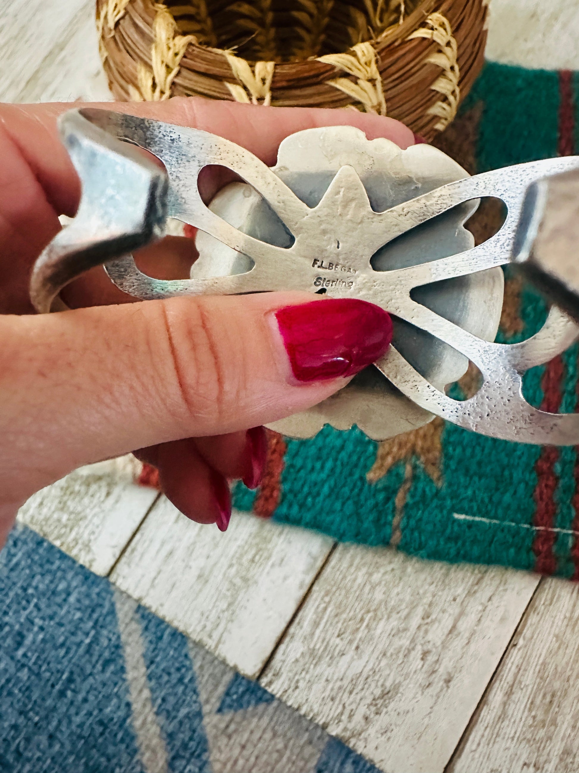 Beautiful Old Pawn Handcrafted Queen Pink Conch Shell and Sterling Silver Cluster Cuff Bracelet. Cuff has an inside circumference of 5 1/4 inches with a 1 inch gap. Width is 2 inches. Signed by the artist and stamped Sterling. Such a cool piece!