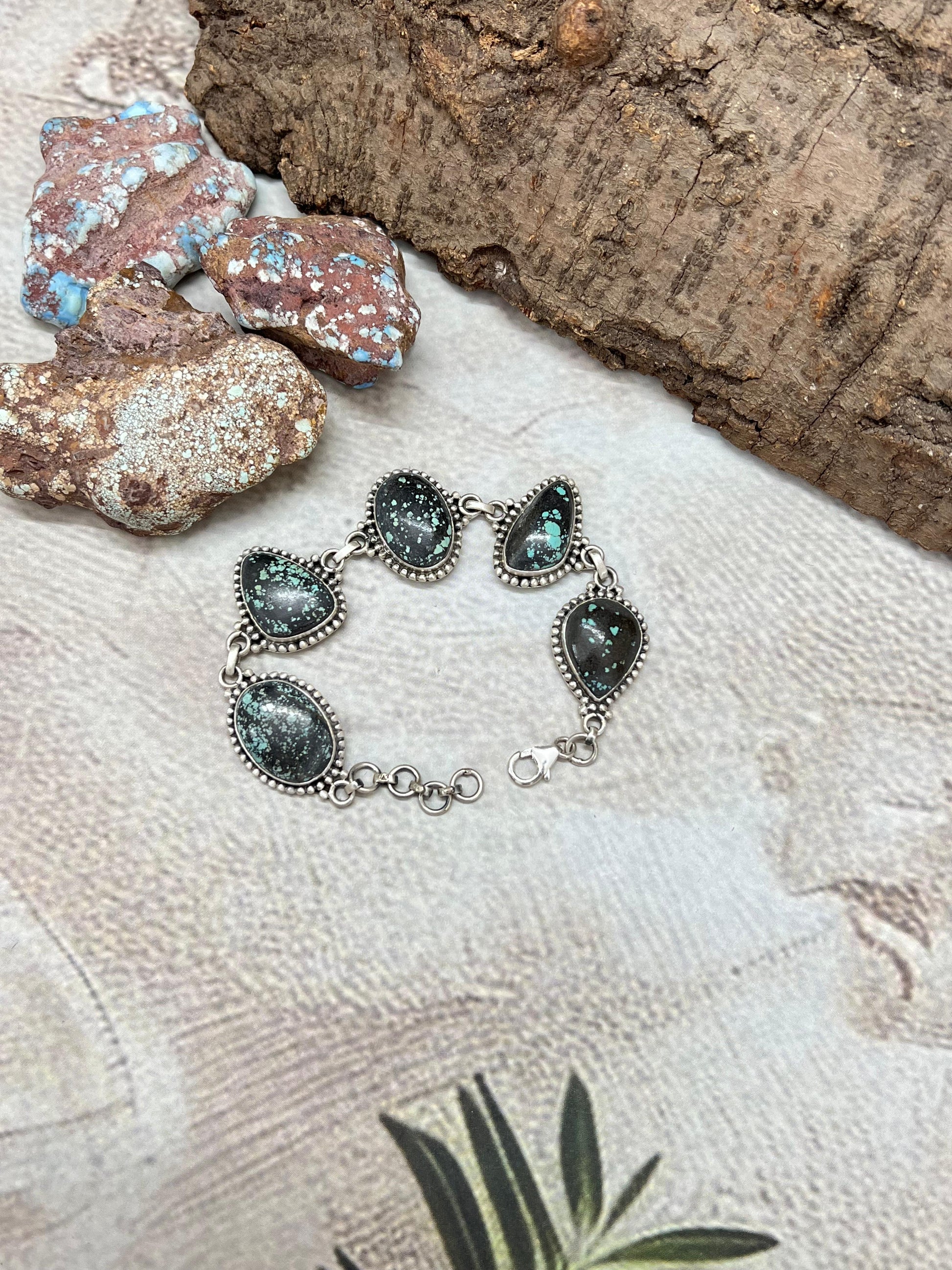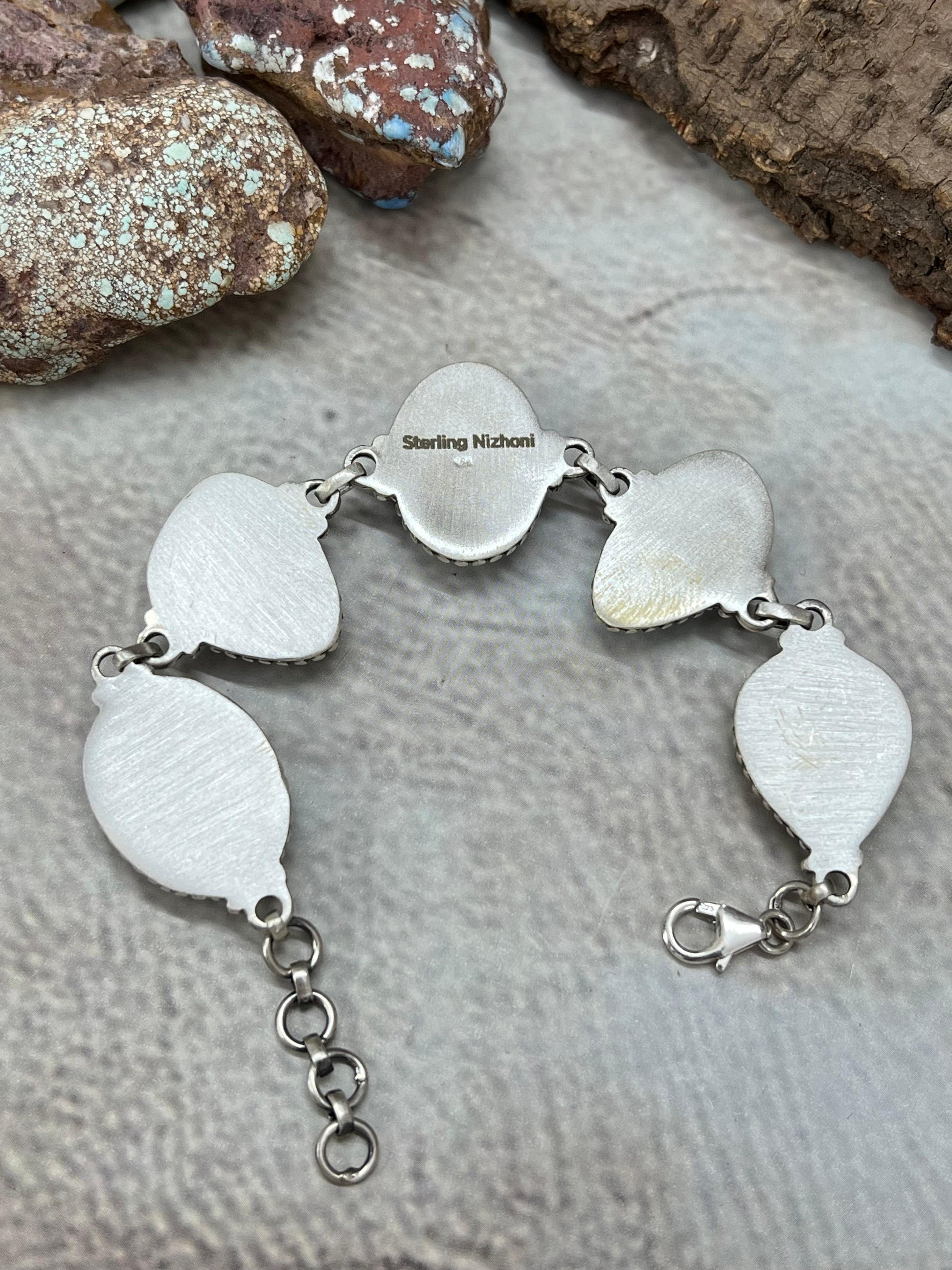Handmade Sterling Silver Lander Turquoise Chain Bracelet with Signed Nizhoni