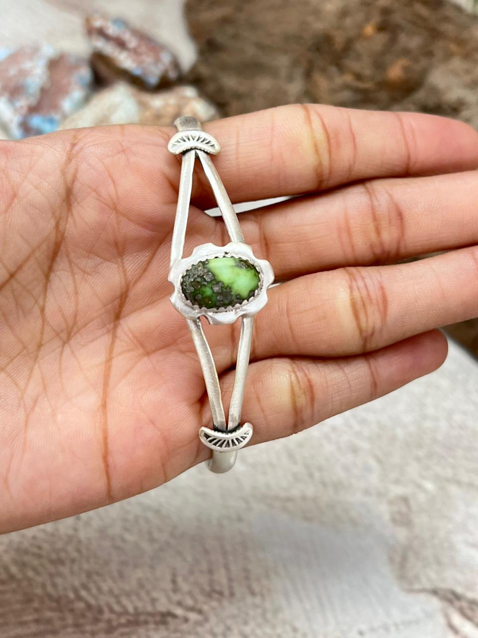 Handmade Sterling Silver Sonoran Mountain Turquoise Cuff Bracelet with Signed Nizhoni