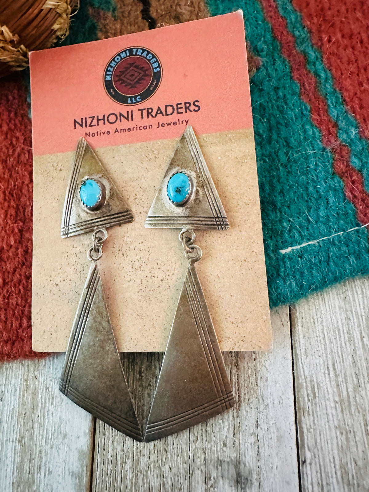 Beautiful Old Pawn Handcrafted Turquoise and Sterling Silver Dangle Earrings. These measure 3 1/2 inches long and 7/8 of an inch wide.