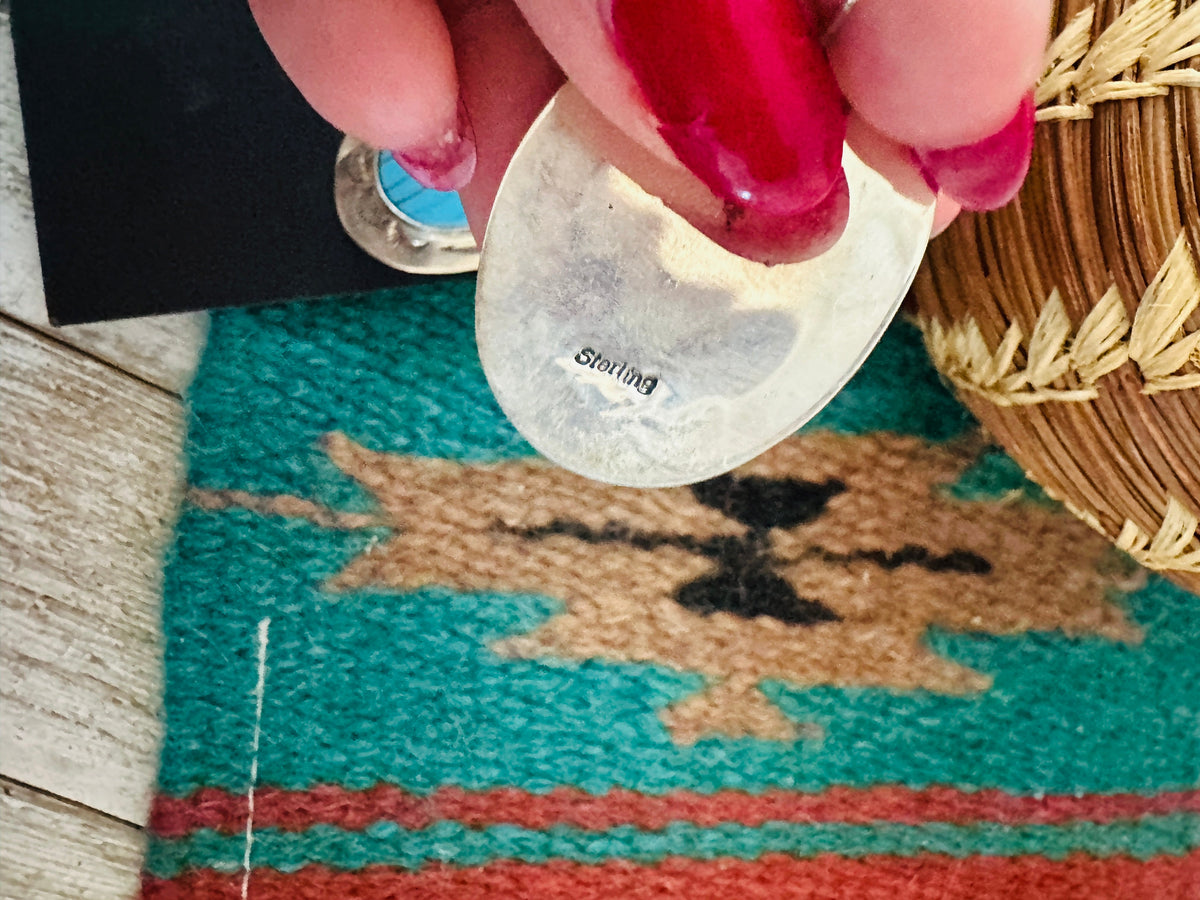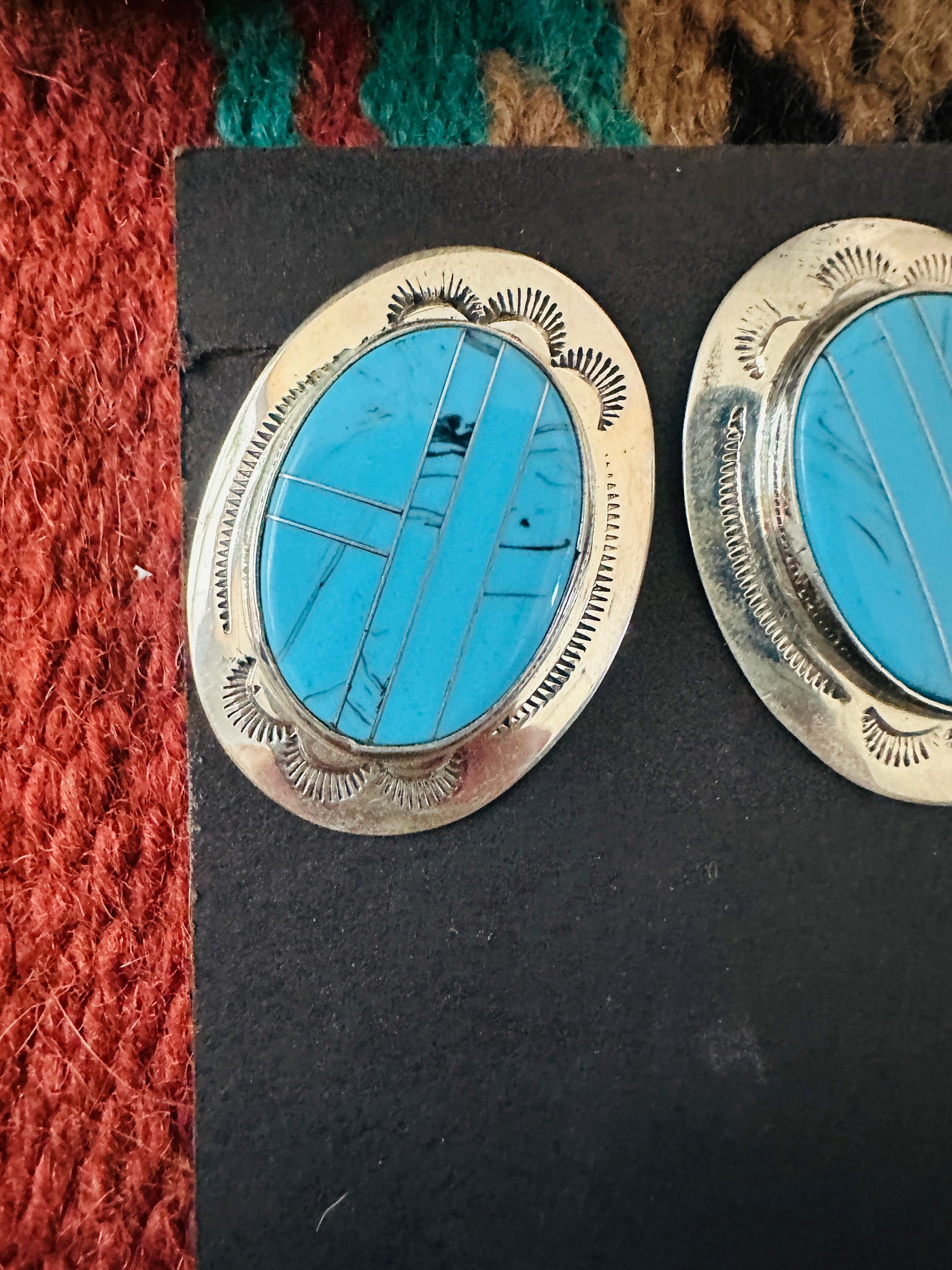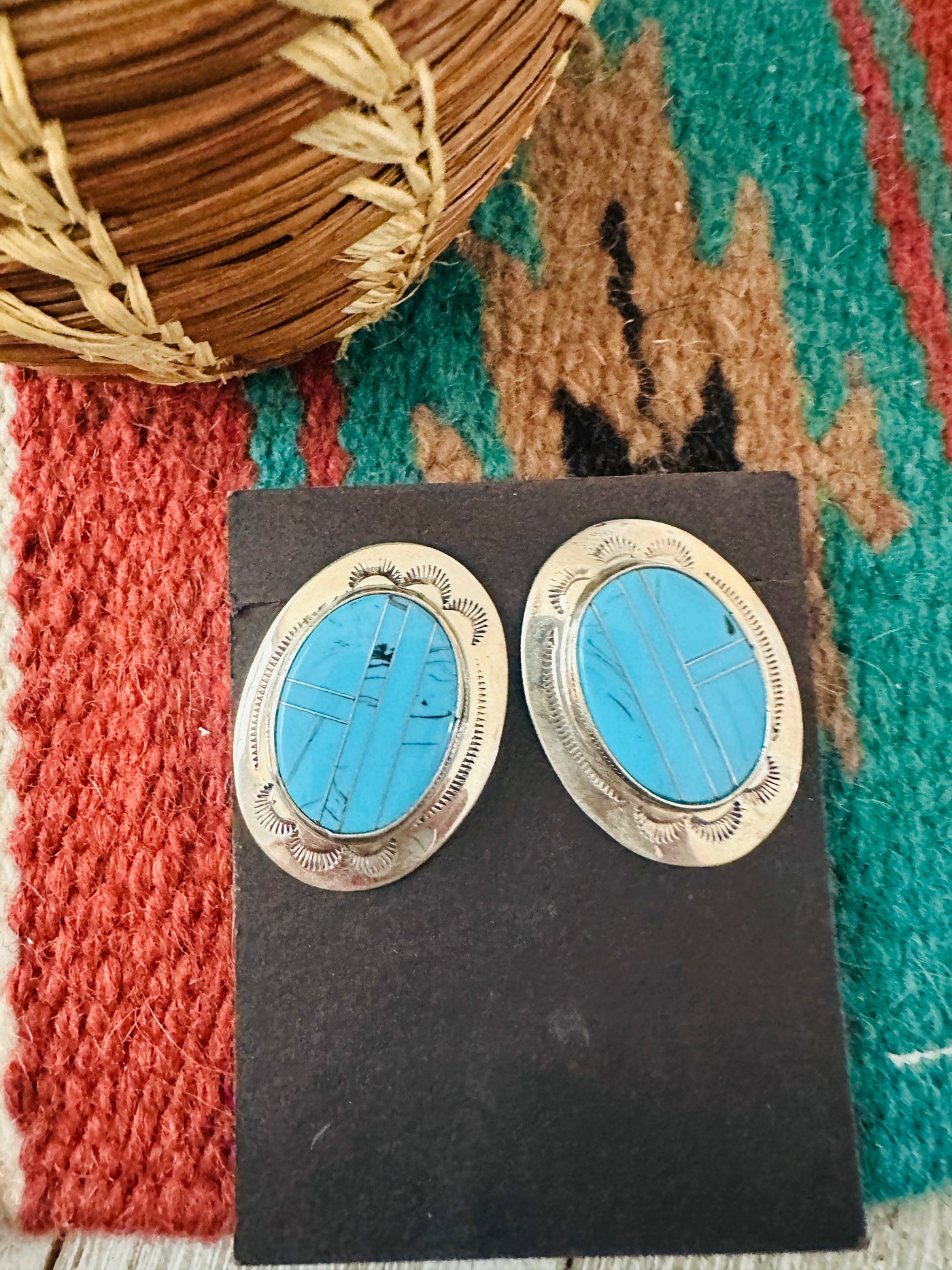 Beautiful Old Pawn Handcrafted Turquoise and Sterling Silver Inlay Post Earrings. These measure 1 1/2 inches long and 1 1/8 inches wide. Stamped Sterling.