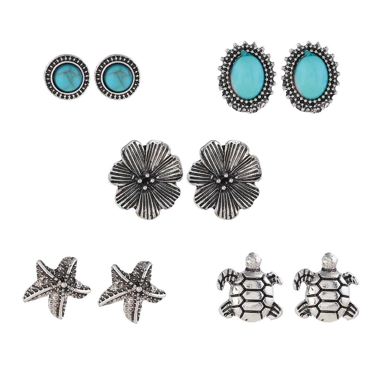 Elevate your beach look with these Oxidized Silver and Turquoise Beach Earrings. The set includes five pairs of studs, each featuring a unique and intricate design that captures the beauty of the beach and ocean.