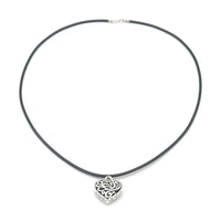 The pendant features a heart shape that is crafted from sterling silver and intricately detailed with artisanal etchings and designs. The heart is suspended from a leather cord, which gives the necklace a rustic and organic feel.