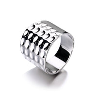 This statement ring is perfect for those looking for a bold and unique accessory to add to their collection. The hammered texture and dimpled detailing create a beautiful and intricate design, while the wide band adds a sense of presence and makes it a true statement piece.