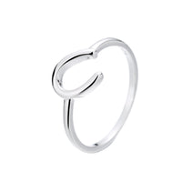 The horseshoe design of the ring is a traditional symbol of good luck and protection, and it is crafted in a way that is both elegant and simple. The horseshoe is slightly curved and set against a smooth band, creating a clean and modern look.