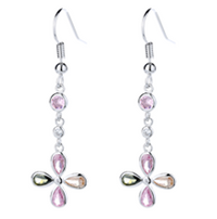 The design of the earrings features a beautiful flower-shaped drop that is adorned with a variety of multi-colored crystals. The crystals sparkle and catch the light beautifully, adding a touch of glamour to the earrings.