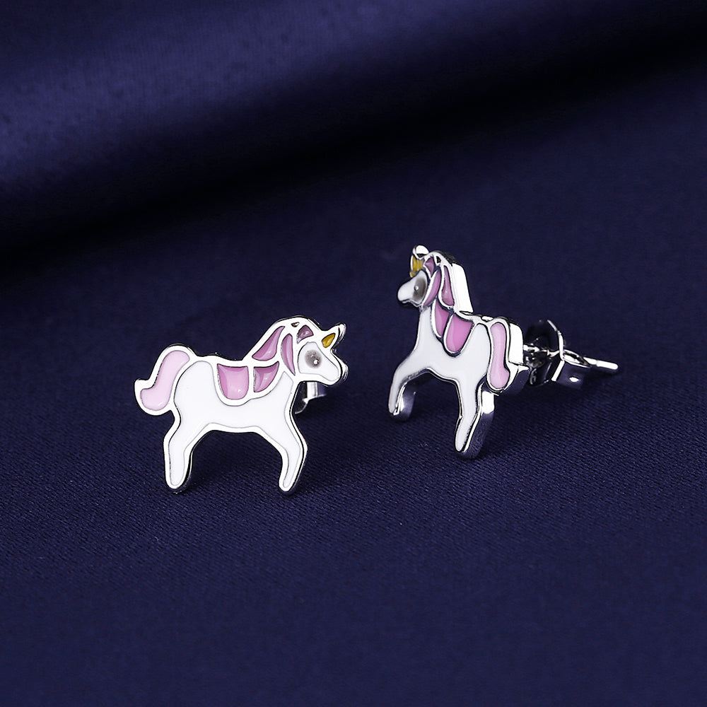 These Sterling Silver Pink and White Unicorn Stud Earrings are a playful and charming accessory that will add a touch of magic and fantasy to any outfit. The earrings are expertly crafted from high-quality 925 sterling silver, which is known for its durability and tarnish resistance, and feature a delicate and intricate unicorn design with pink and white enamel accents.