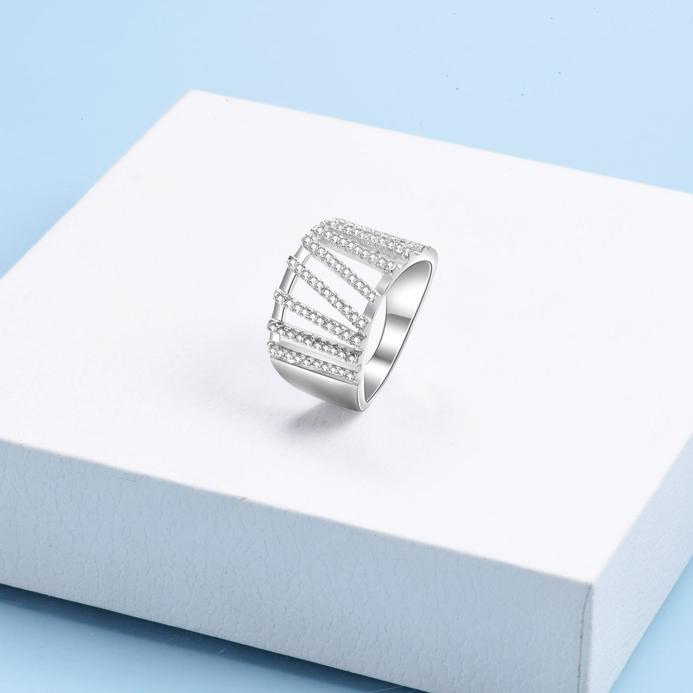 The ring's design is unique and contemporary, featuring multiple bars of varying lengths that are arranged in a geometric pattern. The bars are studded with Swarovski crystals, which catch the light and add a touch of glamour to the ring.