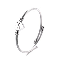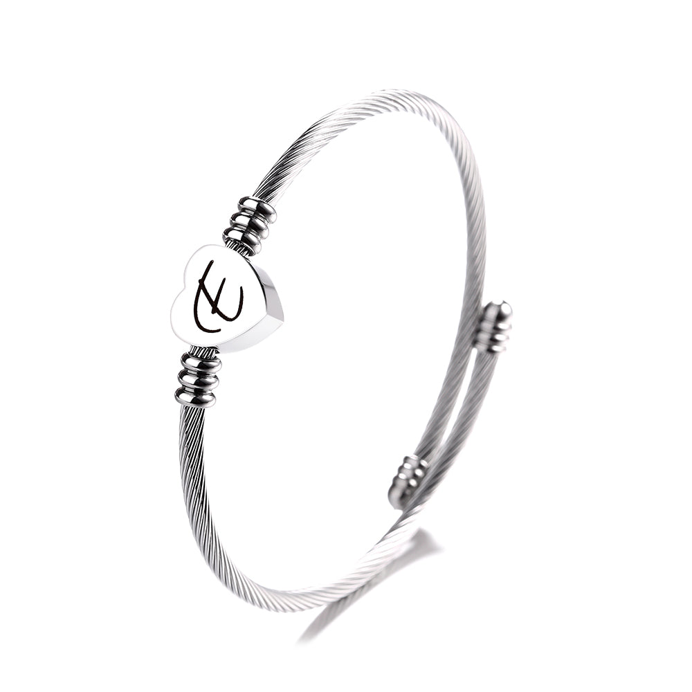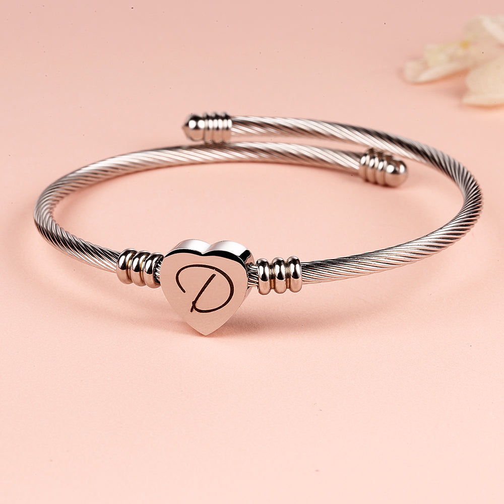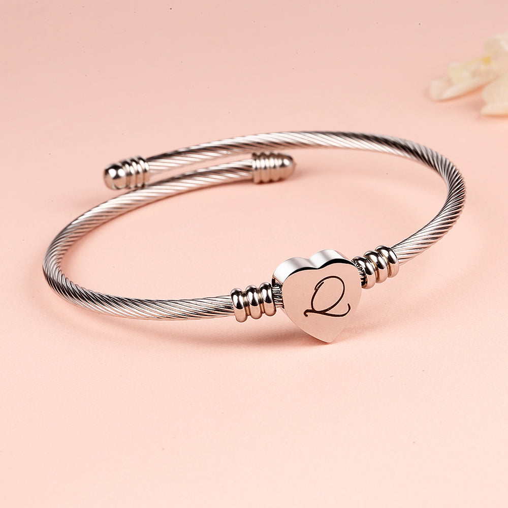 The bracelet's design features a twisted steel cable that is both durable and flexible, making it comfortable to wear. The heart charm adds a touch of romance to the bracelet, while the personalized initial charm allows you to add a personal touch and make it your own.