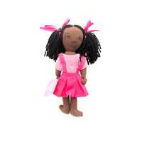 I live in a gingerbread-style house in Cap Haitian. My city is on the north coast of Haiti and surrounded by beautiful beaches. Each day on my walk to school, I pass by giant old Cathedrals and historic monuments that mark my country's African, Spanish and French culture and history. I am glad you are my new friend! Dimensions: 12" Cotton fabric, polyester filled. Colors of dress will vary!