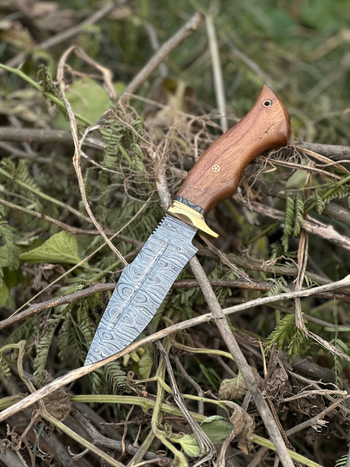 Hunting Blade – 10" Damascus Steel Knife with Rosewood Handle, Brass Guard & Leather Sheath