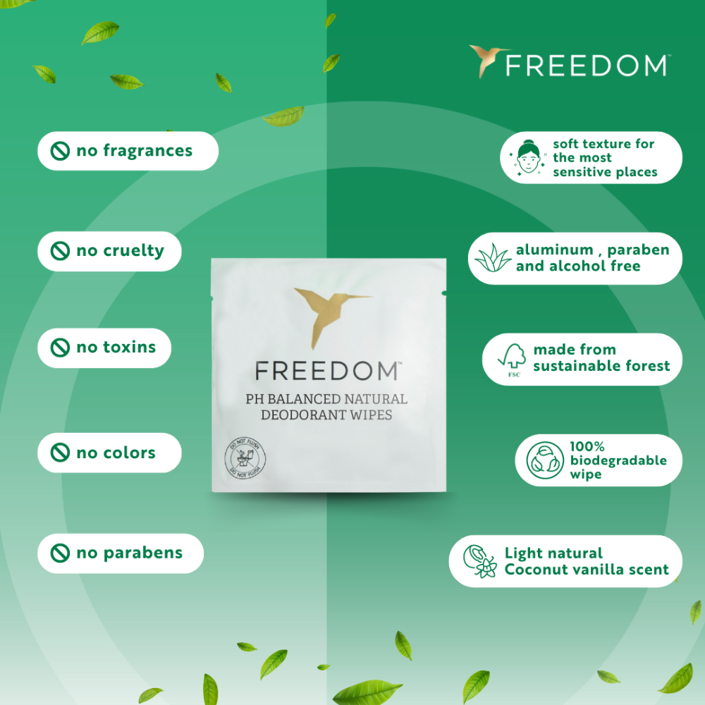 Feel the freedom of freshness no matter where life takes you. FREEDOM PH Balanced Natural Deodorant Wipes are your ultimate companion for staying odor-free and confident throughout the day. Convenient, effective, and made with your health in mind, these wipes are perfect for the active, on-the-go lifestyle.