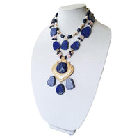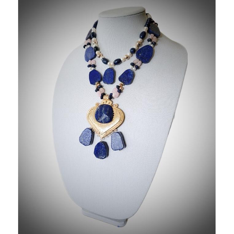 We are so excited about this design ! This antique statement necklace is made with large lapis lazuli stones, accented with morganite gemstones. Also with rondelle shaped freshwater pearls and lapis lazuli gemstones. Also with 6mm rose gold colored hematite beads. The pendant is antique brass colored in rose gold. This is 2 separate necklaces.