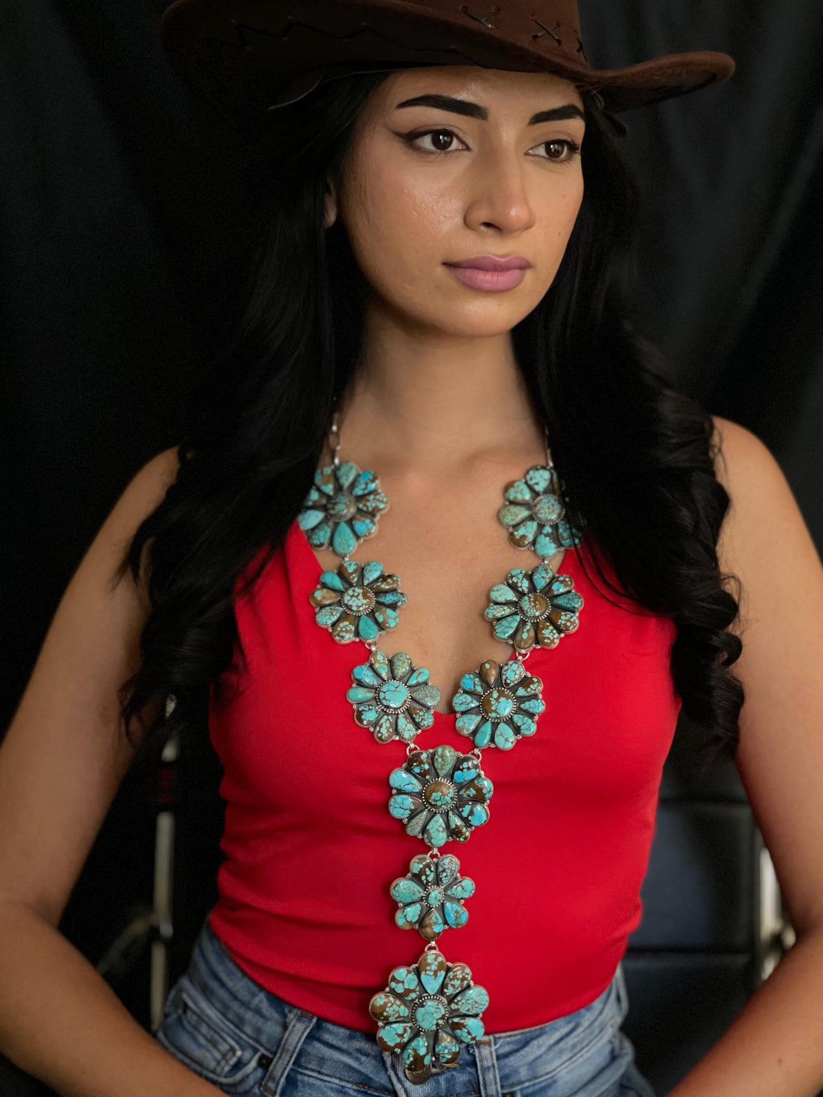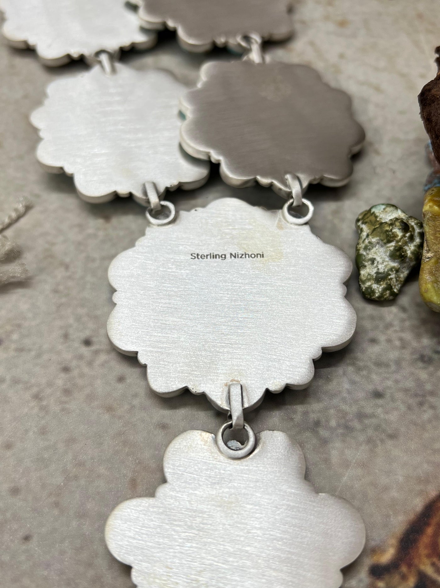 Such gorgeous craftsmanship! Sterling Silver Number 8 Turquoise Necklace Measures Length 23+6" Extension, Width 2" with an additional drop of 7".
