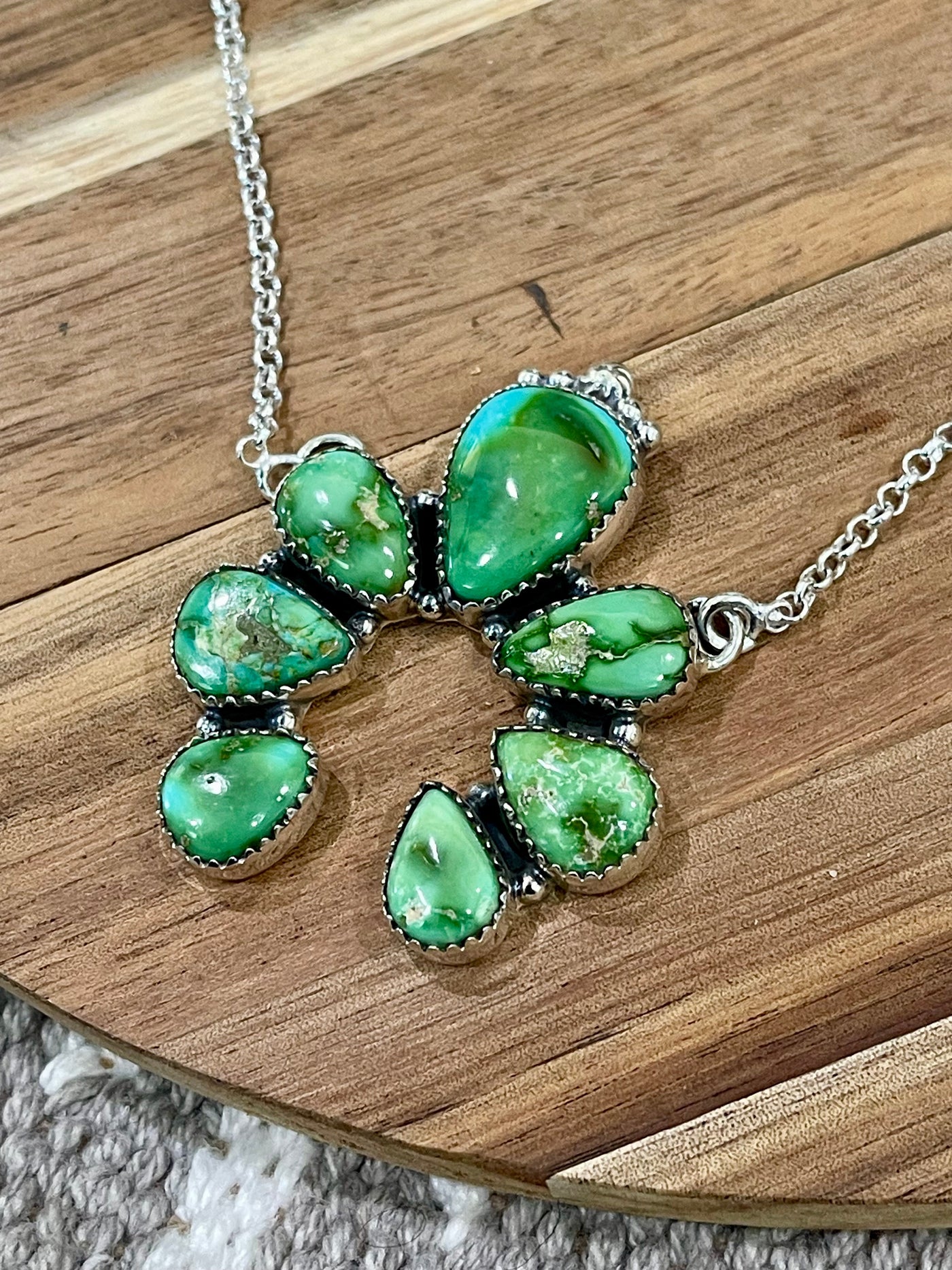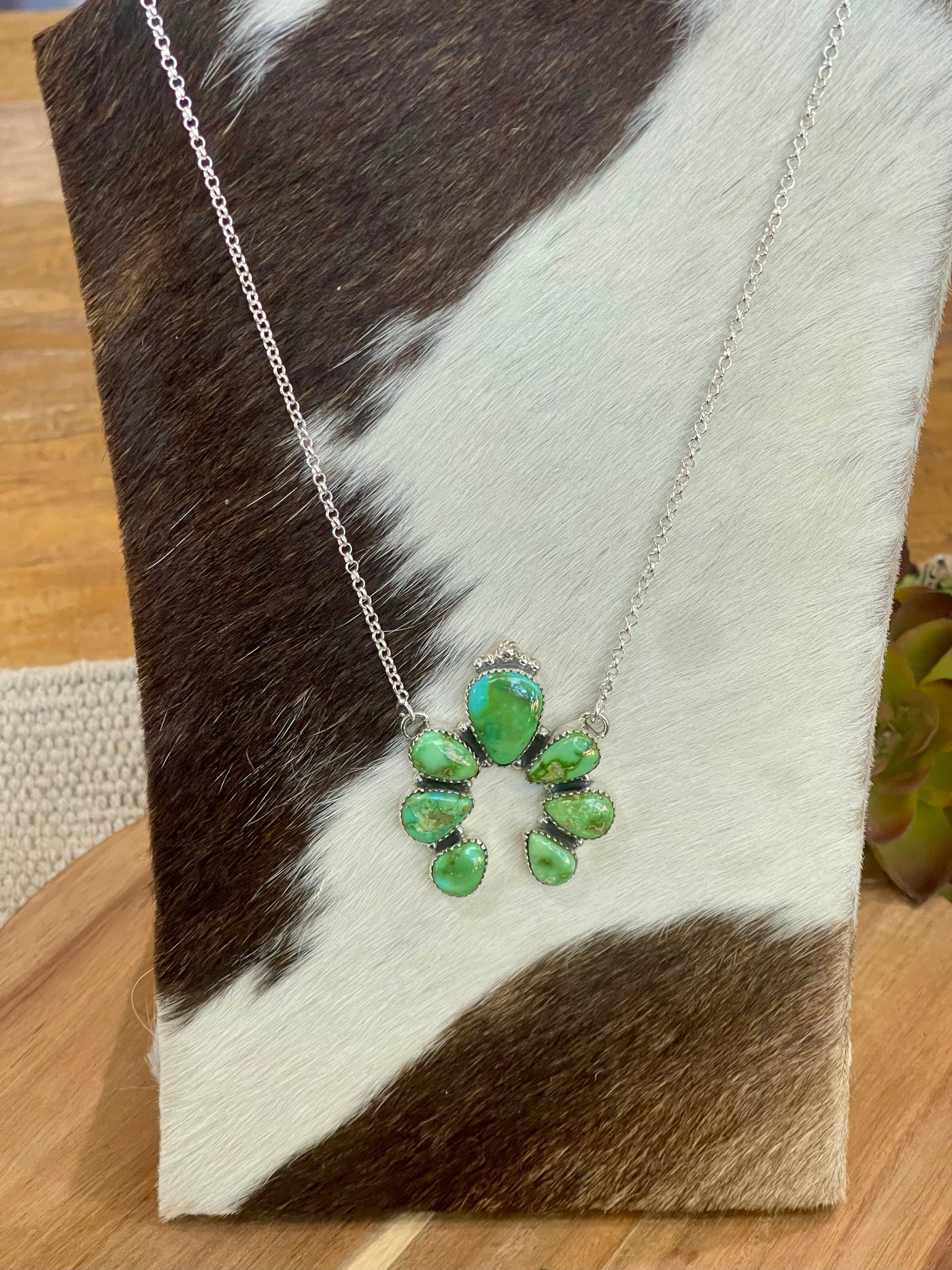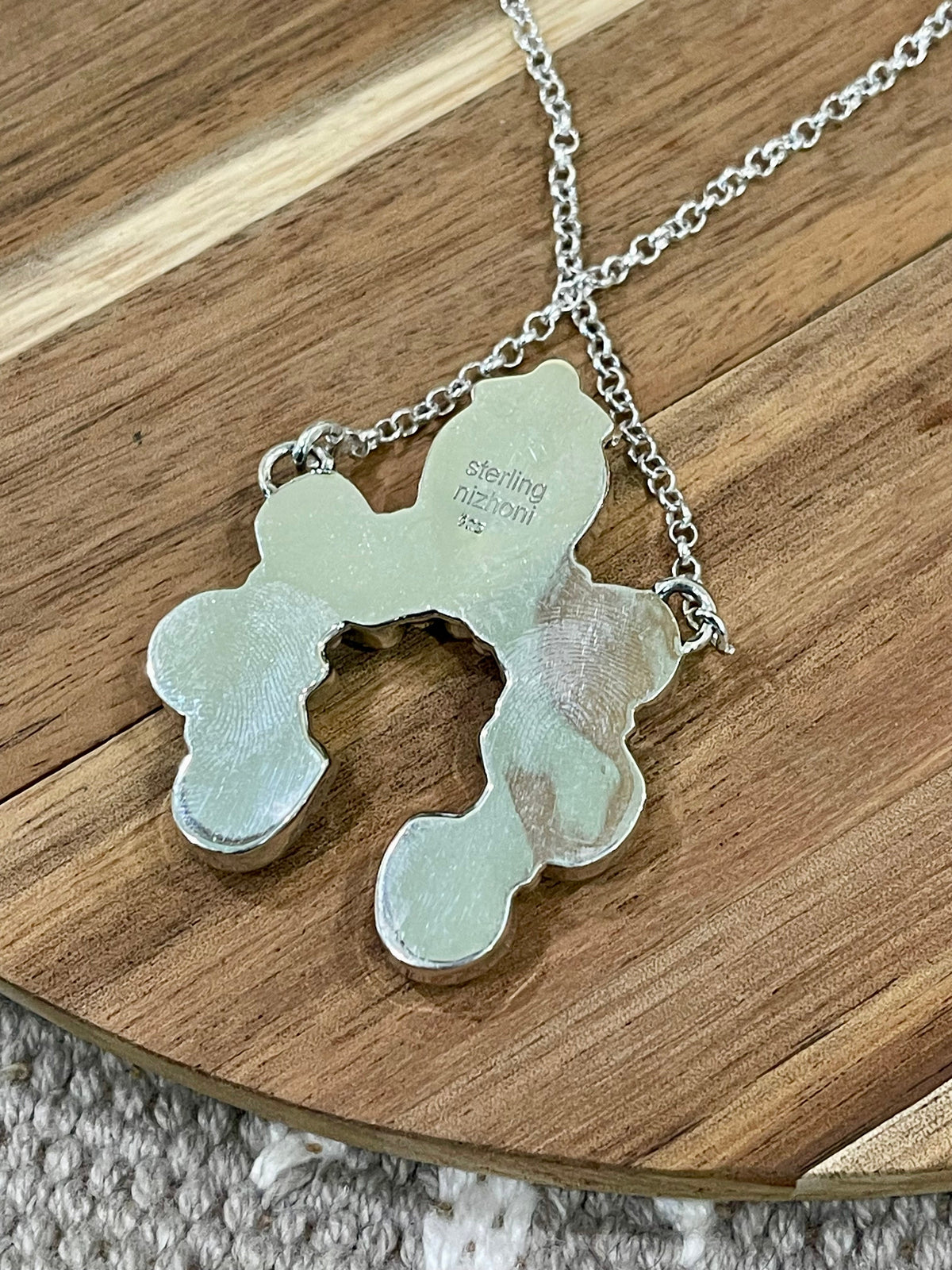 Gorgeous Sterling Silver & Sonoran Mountain Turquoise Naja Cluster Necklace. This beauty measures 17-19 inches long. The pendant measures 1 7/8 inches long & 1 1/2 inches wide.