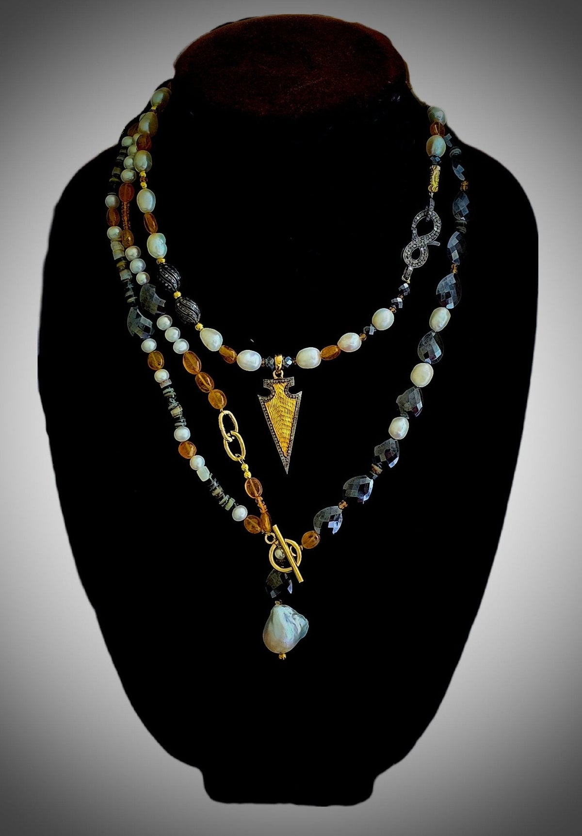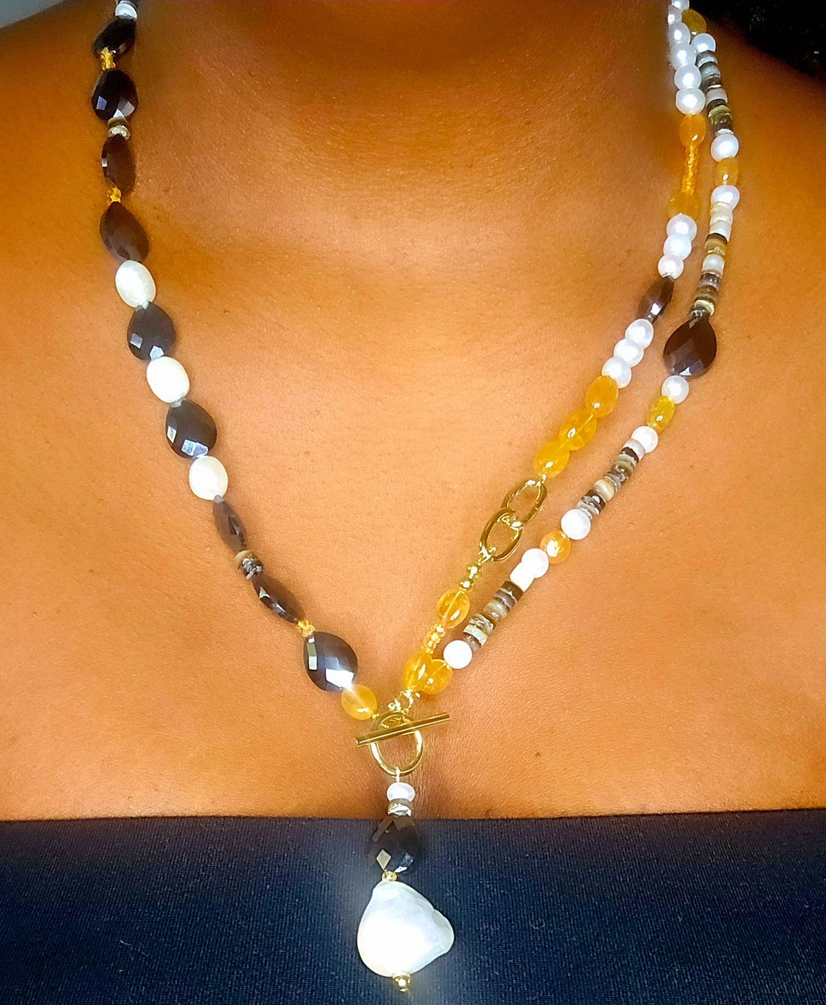 Transform your collar with this exquisite and one-of-a-kind moissanite necklace. You'll love the natural moissanite stones, expertly crafted into faceted pear shapes. Adorned with 4mm rondelle Tahitian Black Pearl Oyster Shells and 3mm Certified Orange Sapphire stones situatedin between Certified natural yellow sapphire stones and freshwater pearls, this necklace is truly unique. Adding to its charm are 6mm irregular shaped freshwater pearls, accentuated by a large Baroque Pearl, a Moissanite stone, and a Certified Orange Sapphire stone on the toggle clasp. Whether you prefer a sleek lobster claw closure for adjustable length or a toggle clasp at the end, this necklace is versatile and elegant. It even comes with a GRA Certificate of Authenticity, proving its quality and luxury. Perfect for any occasion, this necklace looks stunning paired with a collar, o-neck, or v-neck shirt. It's a piece fit for passing down through generations..