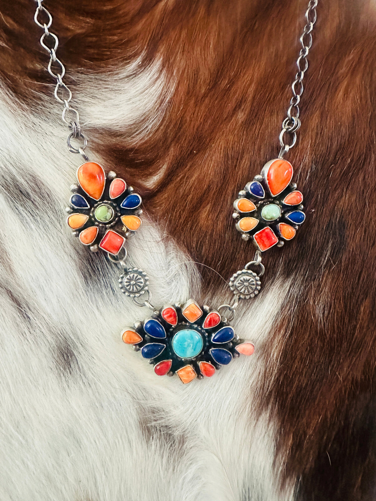 Beautiful Old Pawn Vintage Handcrafted Multi Stone and Sterling Silver Cluster Necklace. Necklace measures 16 inches long. Width is 1 1/8 inches. Signed by the artist Sheila Becenti and stamped Sterling.