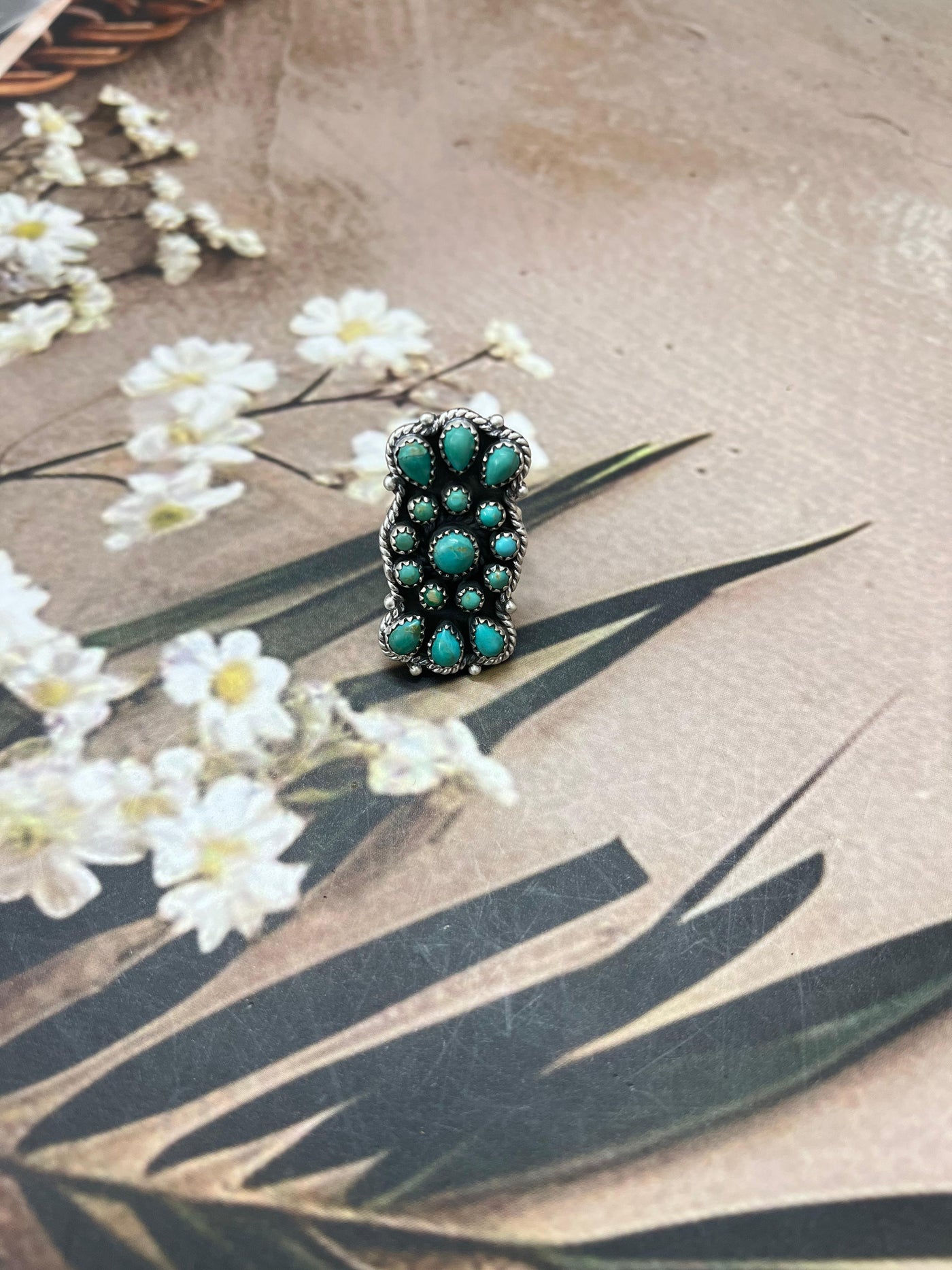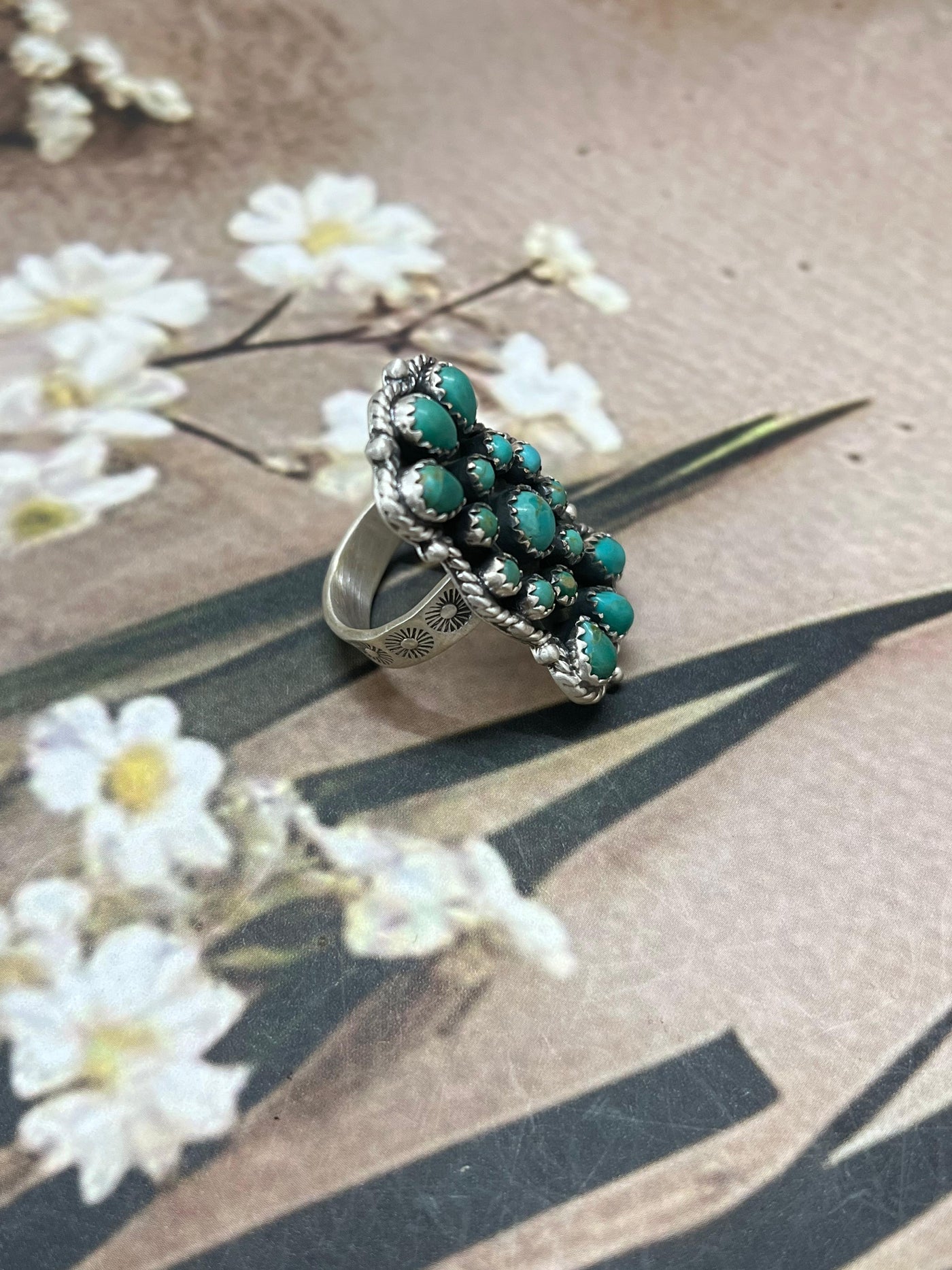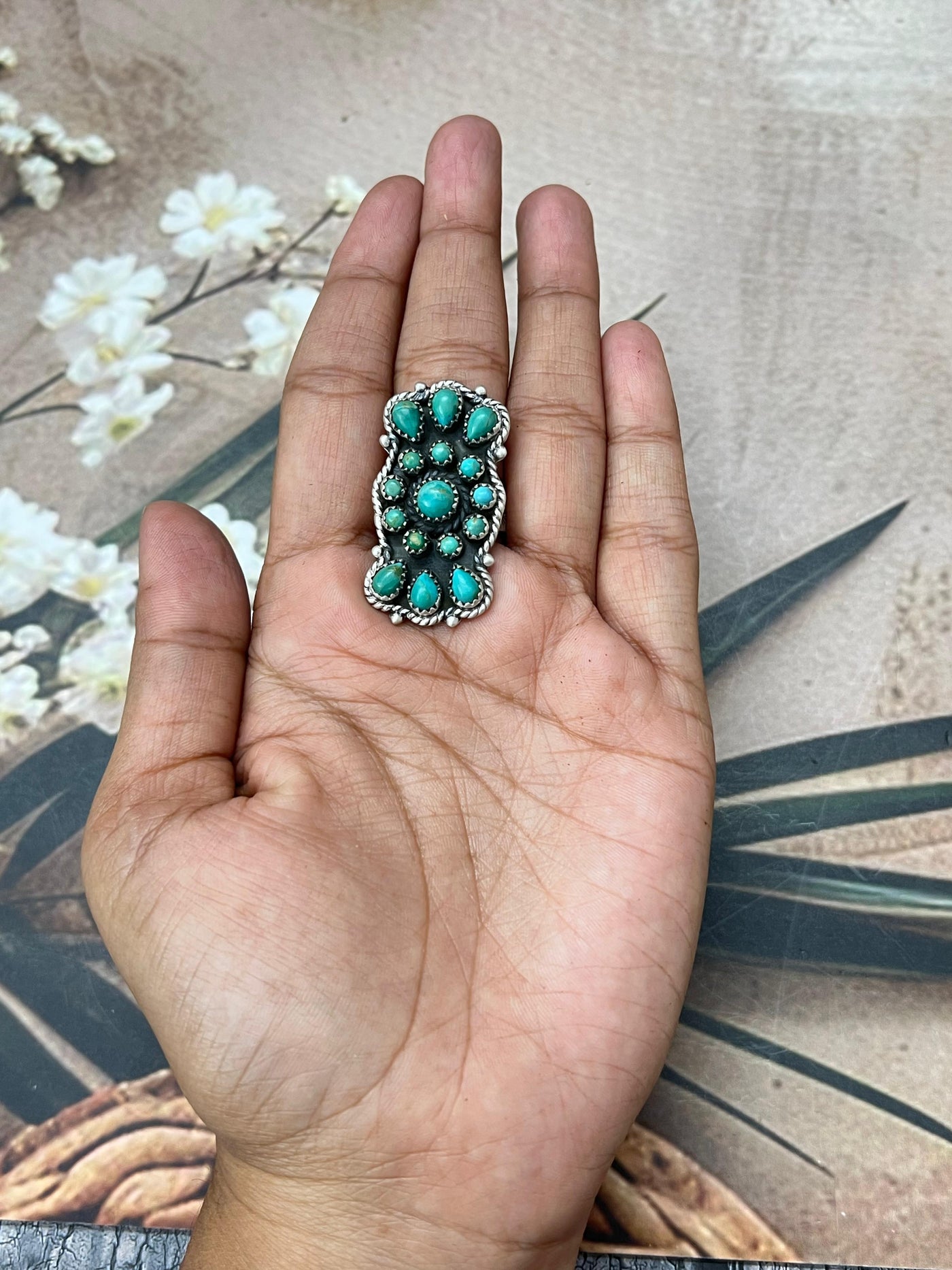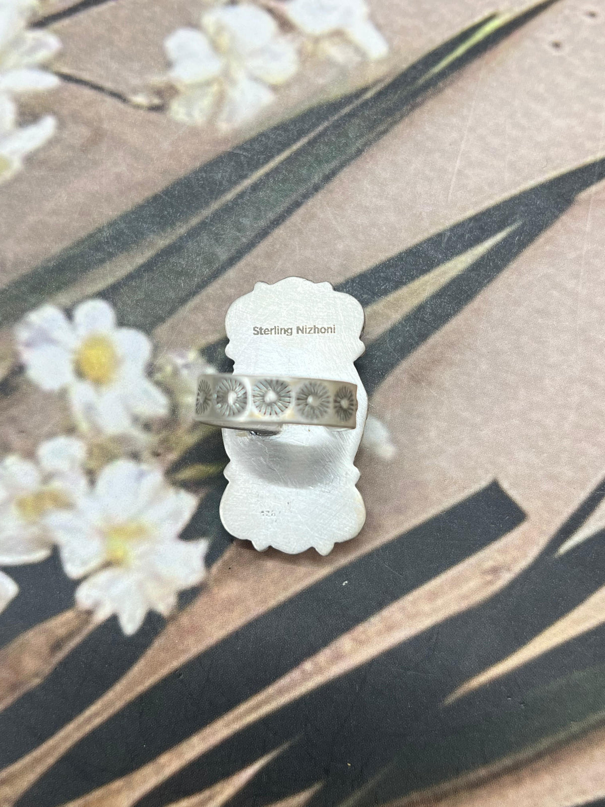 Introducing our latest masterpiece! This stunning Sterling Silver Kingman Turquoise adjustable ring is a true showstopper. With dimensions of 1 3/8" in length and 7/8" in width, it’s designed to make a bold statement.