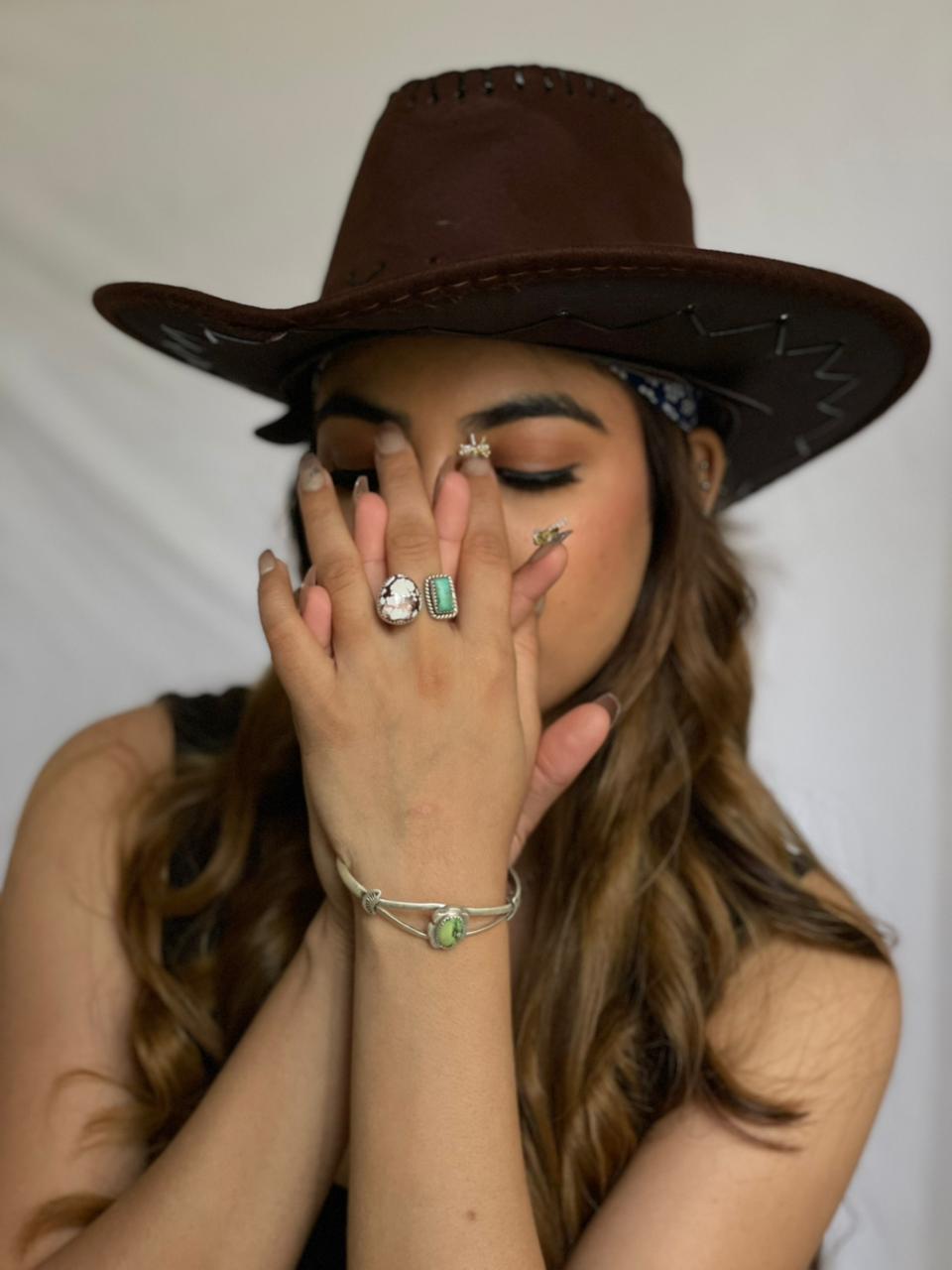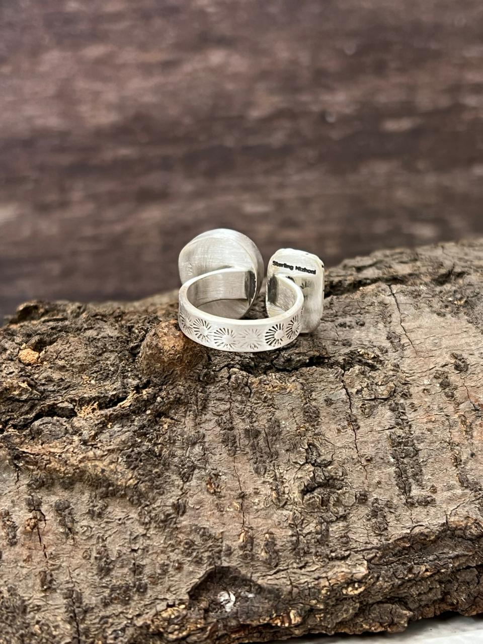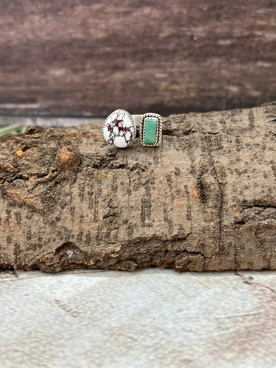 Handmade Sterling Silver Wild Horse Magnesite with Kingman Turquoise Adjustable Ring with Signed Nizhoni (9)