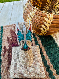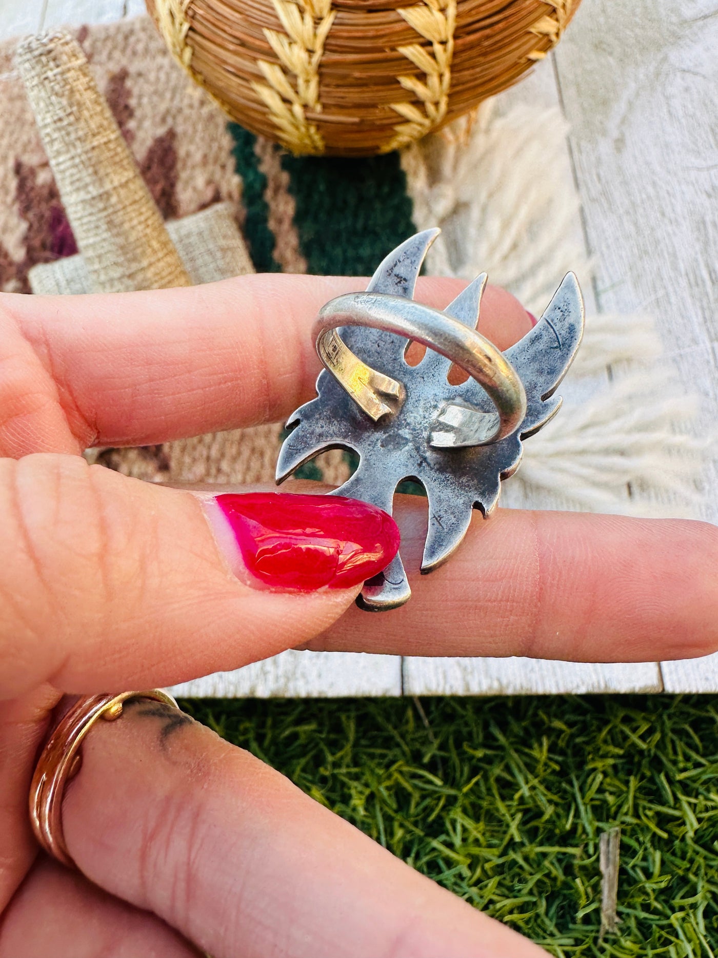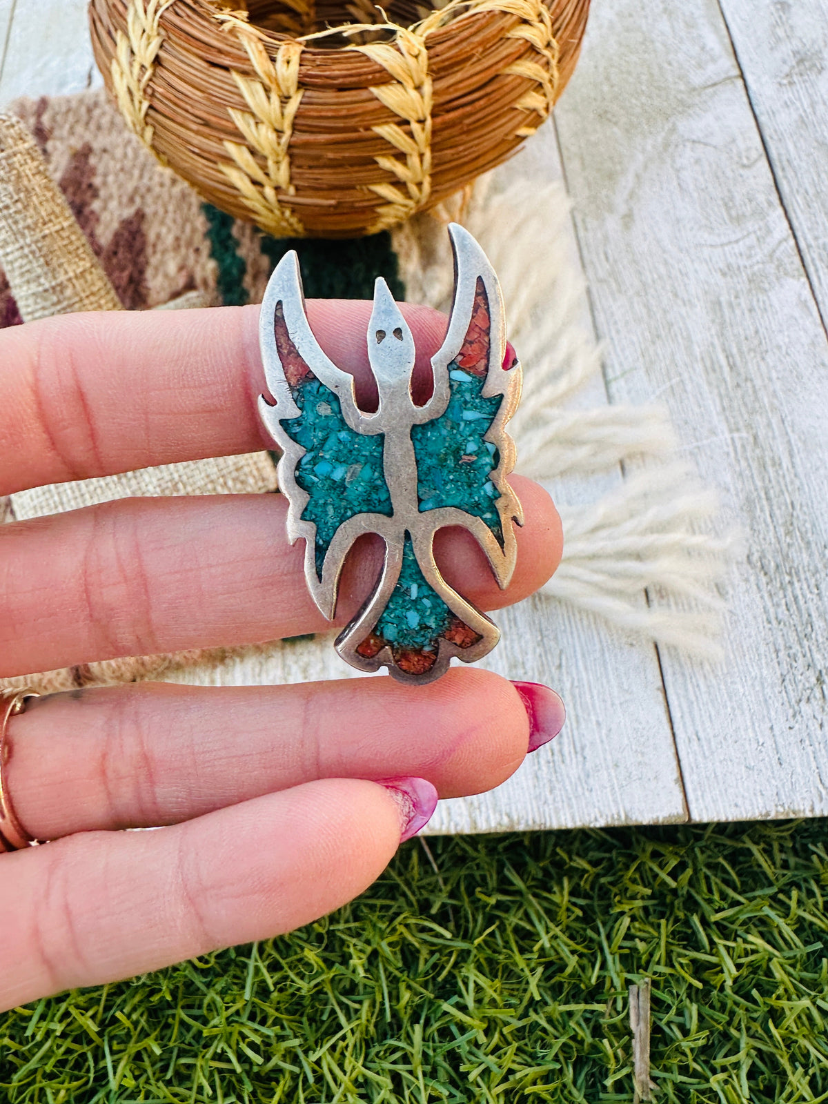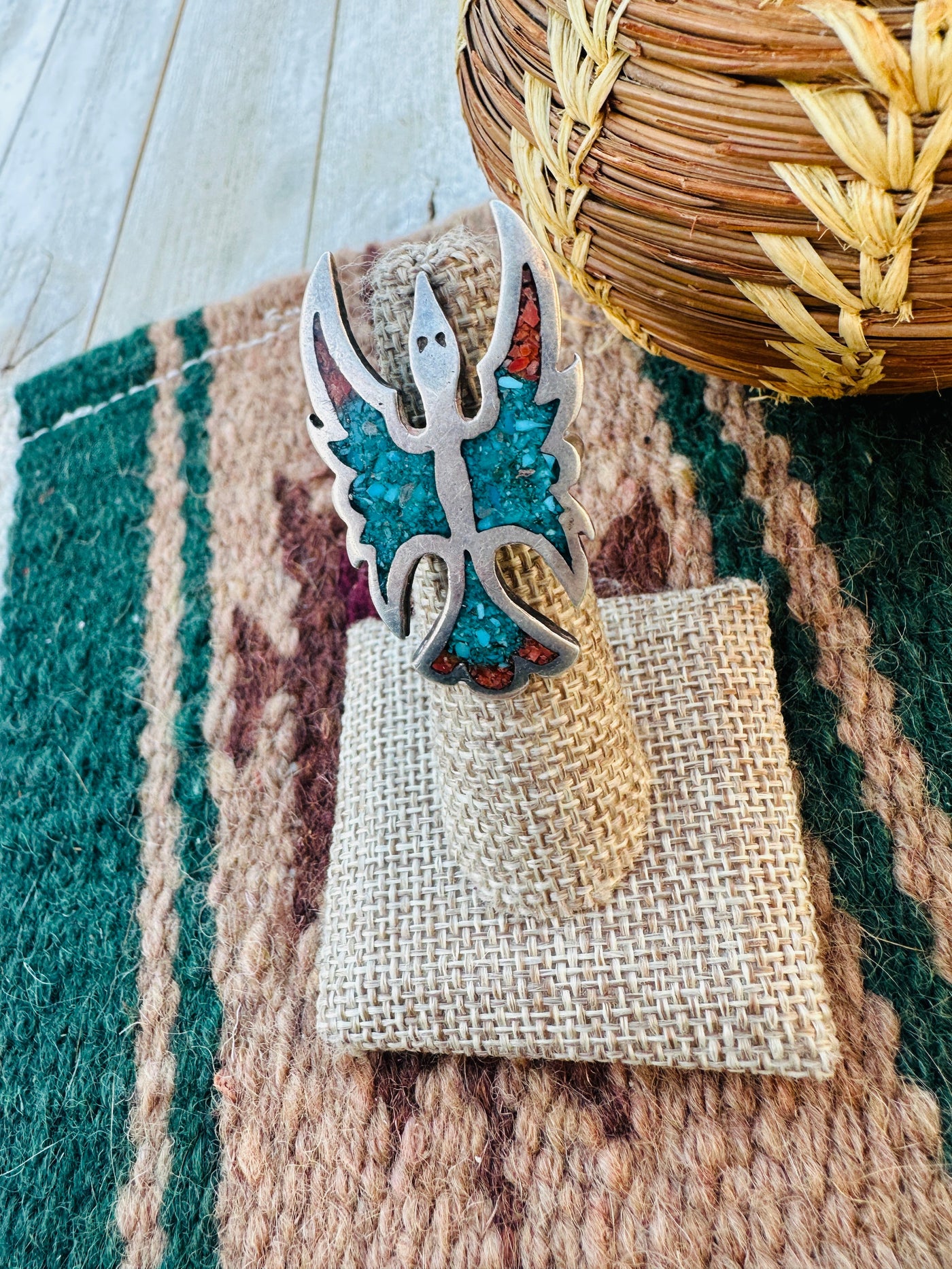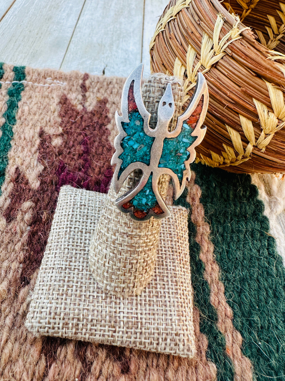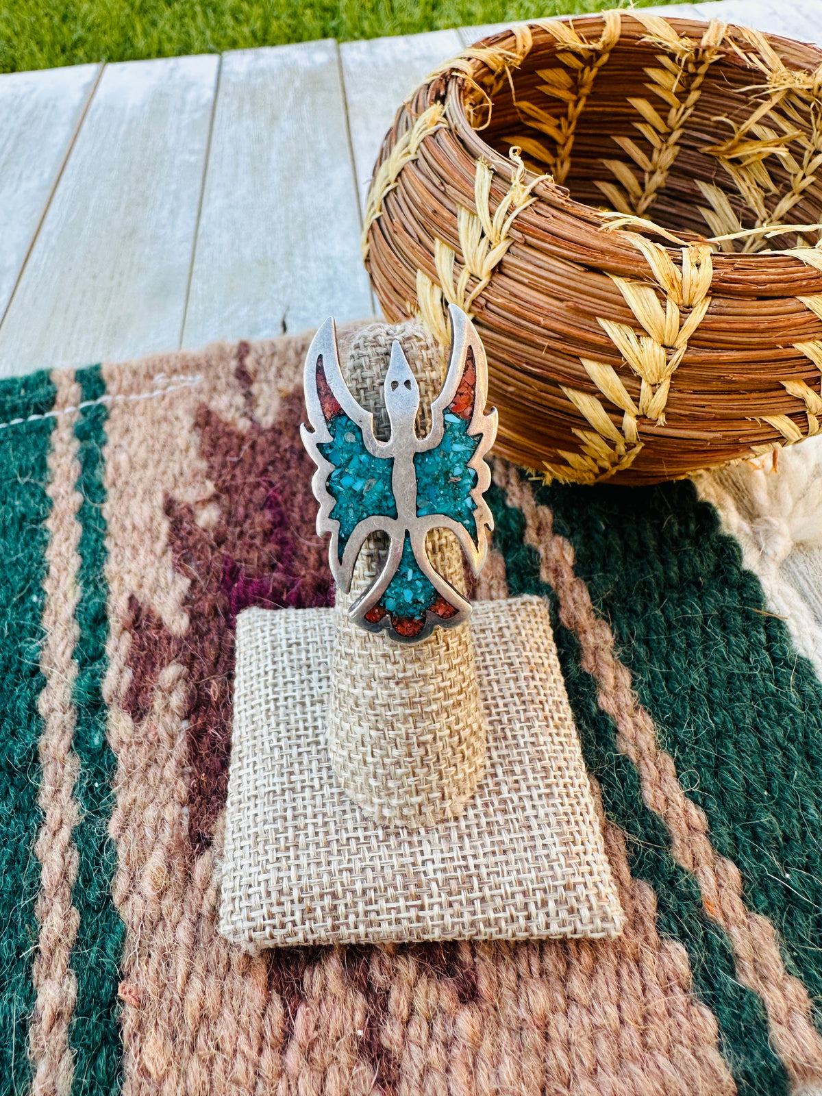 Beautiful Old Pawn Handcrafted Sterling Silver, Turquoise and Coral Chip Inlay Waterbird Ring. Size 5.75. Measures 1 3/4 inches long and 1 inch wide. Excellent condition!