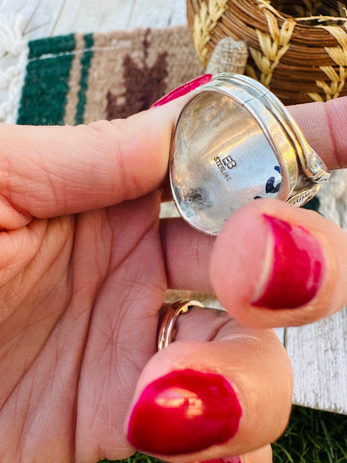 Beautiful Old Pawn Handcrafted Sterling Silver and Turquoise Ring. Size 12. Measures 1 1/4 inches wide. Signed by the artist and stamped Sterling. Excellent condition!