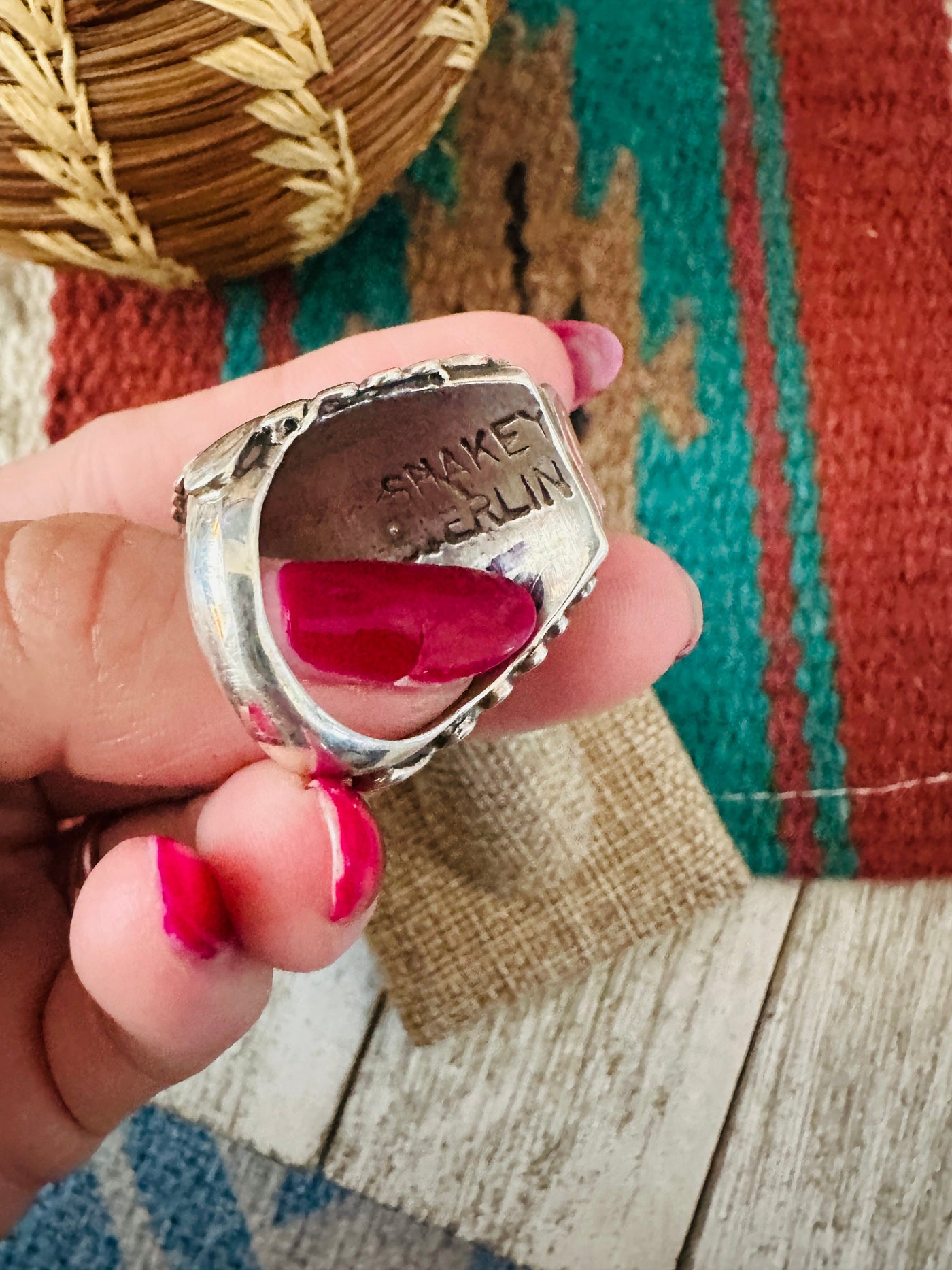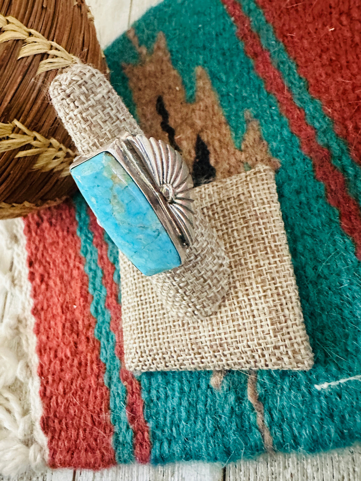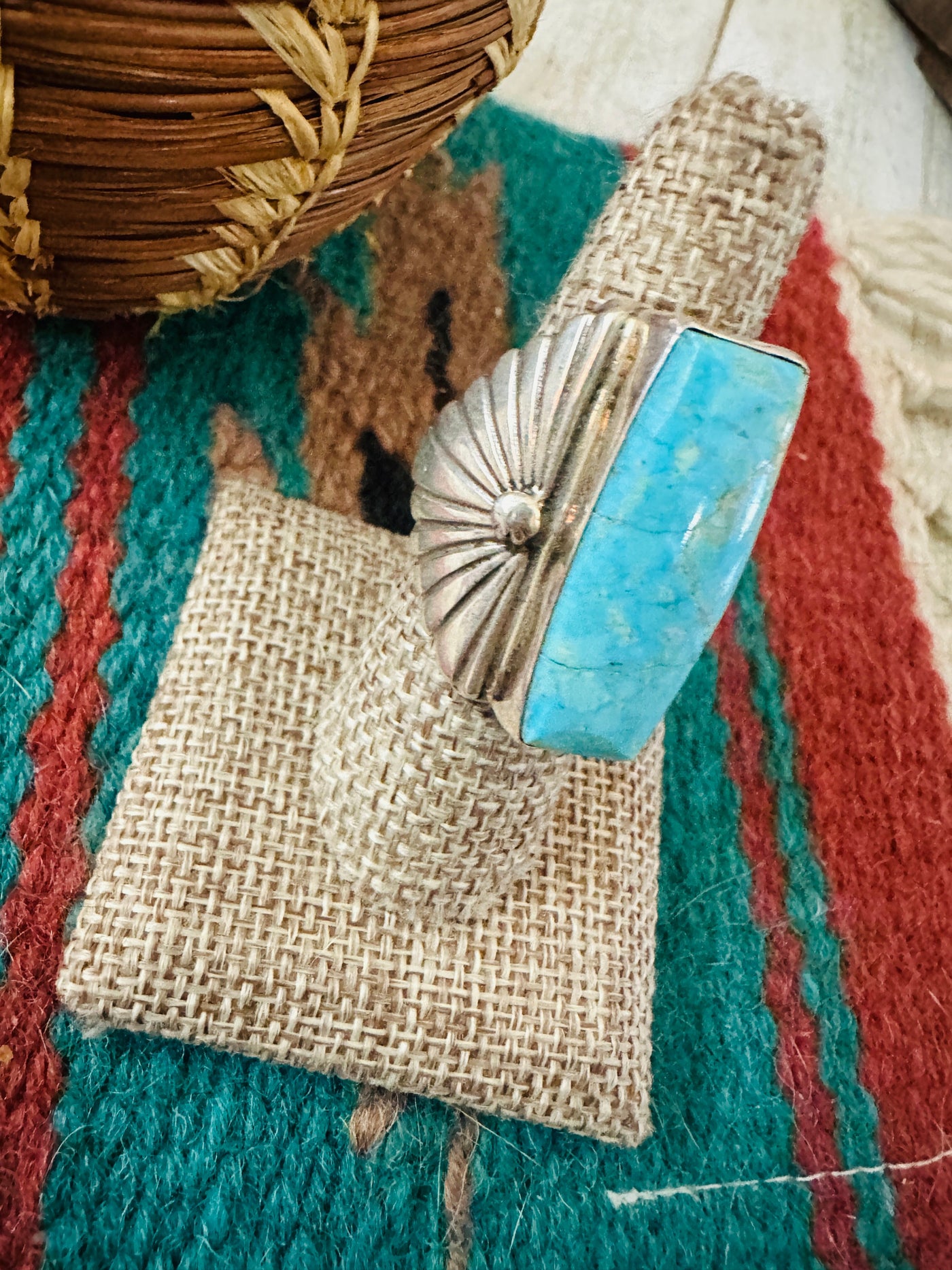 Beautiful Old Pawn Handcrafted Sterling Silver and Turquoise Ring. Size 9. Measures 1 1/4 inches wide. Signed by the artist and stamped Sterling. Excellent condition!