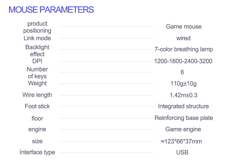 Description: Newly upgraded 6D key position layout, quick operation and perfect for gaming Four speed DPI to be adjusted, one key speed regulation Equipped with seven colors breathing light effect, flowing light High speed positioning, laser-game engine The use of enhanced durability game level Micro- motion, not only to move quickly, but also to click accurately, the mouse uses game specific white dot Micro- motion, strong rebound, long-term use, the feel is not easy to reduce!