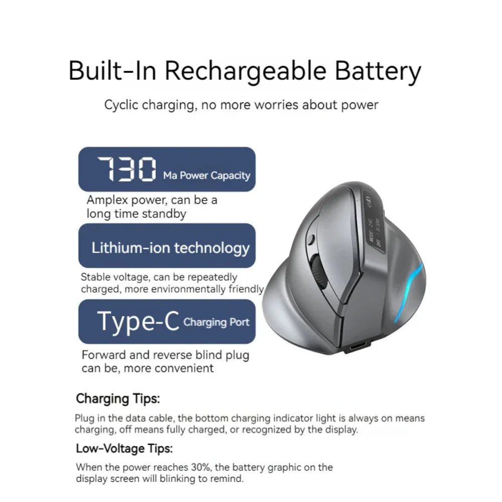 Crafted from high-quality materials, the Dual Mode Wireless Vertical Mouse is built to withstand the rigors of daily use. It is not only comfortable but also durable. The long-lasting battery ensures that you won't be interrupted in the middle of your most important tasks. With intuitive button placement and a comfortable grip, this mouse is designed for maximum productivity and long-term reliability.