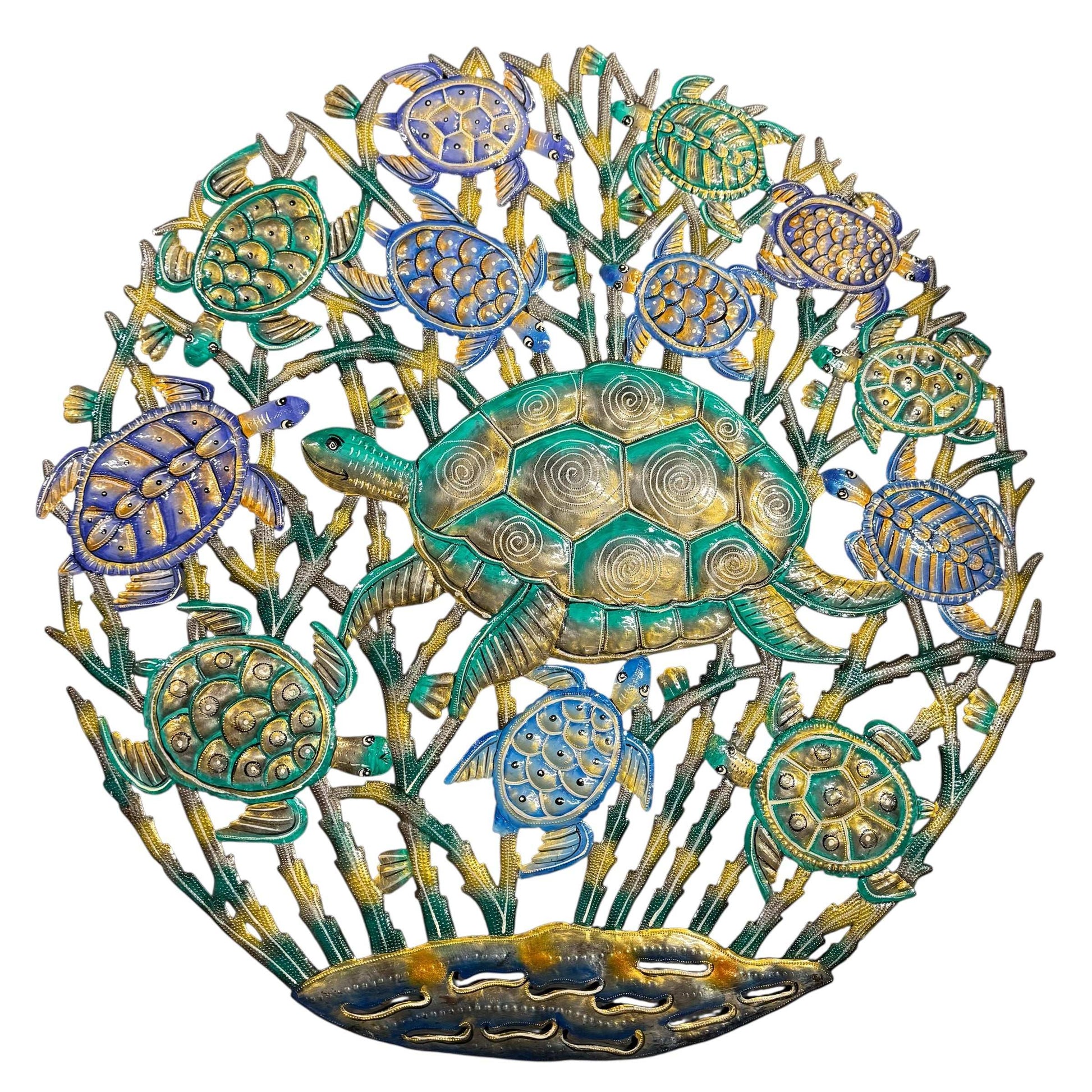 One of the most celebrated Haitian art forms, steel drum art is always a winner! Each piece is hand crafted from recycled 55 gallon drums using only a hammer and a few small tools that resemble railroad spikes. Each piece is a true work of art!