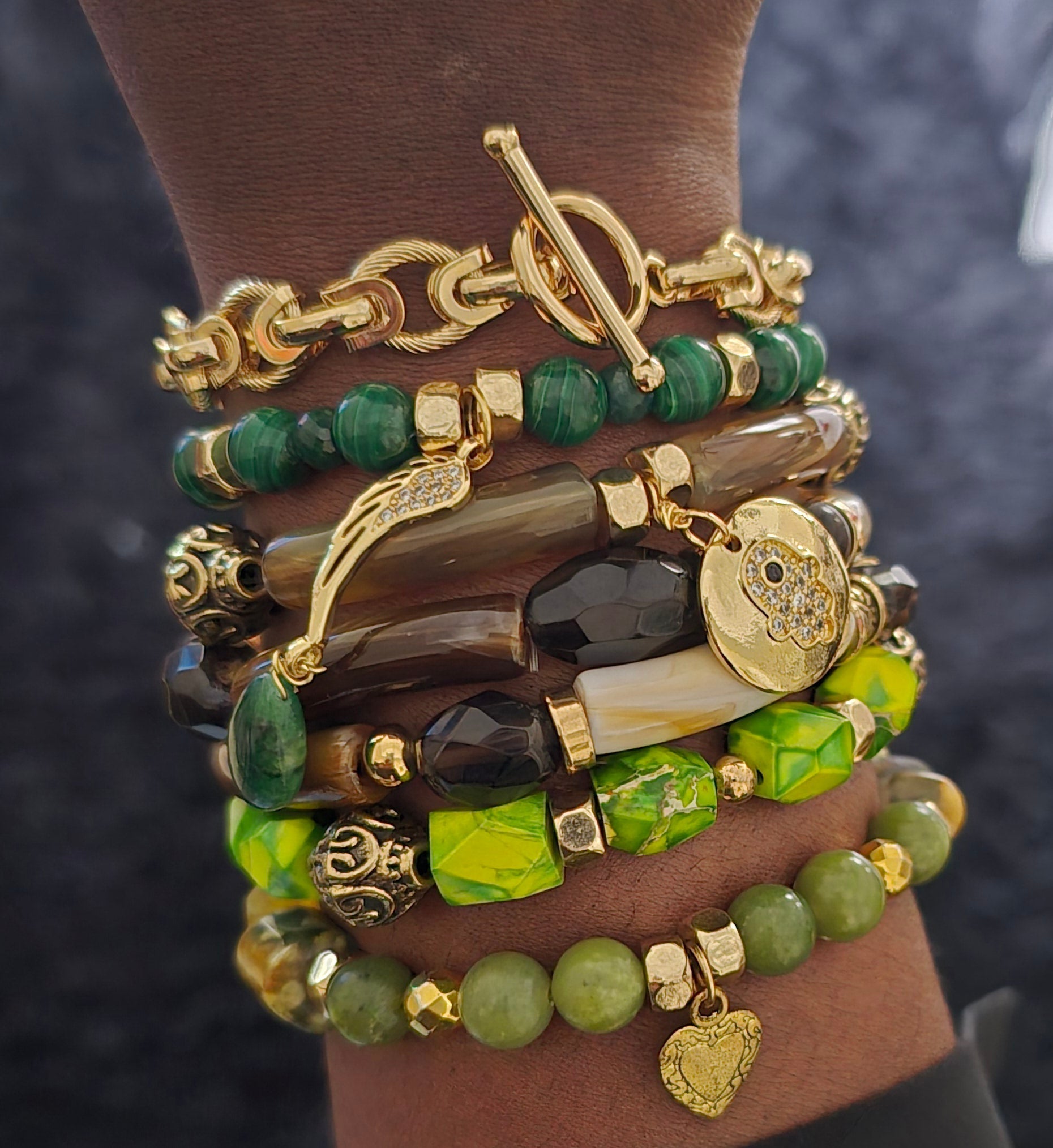 The Utlimate Wealth and Abundance attraction bracelet set. This handmade bracelet set is made with different kinds of green gemstones. First layer is a genuine 6mm smooth malachite bracelet with 3mm Columbian Emeralds in between along with gold brass spacers. The charm is a micropave' wing with an Emerald tear drop on the end. Other bracelet is made with forest green died 6mm smooth round jade beads with gold brass beads and irregular shaped green garnet beads with a heart charm charm. Another bracelets is made with acrylic bamboo tubes with brass antique spacers and stainless steel evil eye charm. Last bracelet is made with 8mm irregular shaped green sea sediment jade beads with brass antique spacers in between. This unique shade of green gemstones bracelet is perfect for completing your fall look.