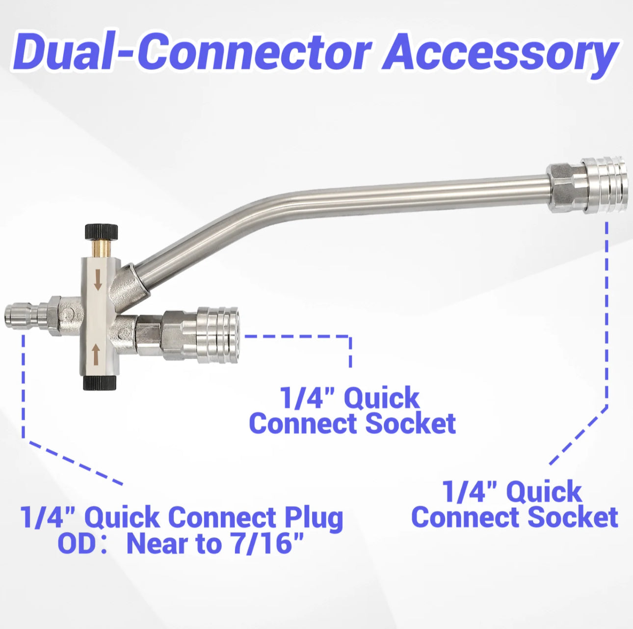 Dual Connector Design β Features two connector ends: a longer end for the pressure wash nozzle and a shorter end for the snow foam lance, ensuring uninterrupted water flow even when the foam dispenser is attached.