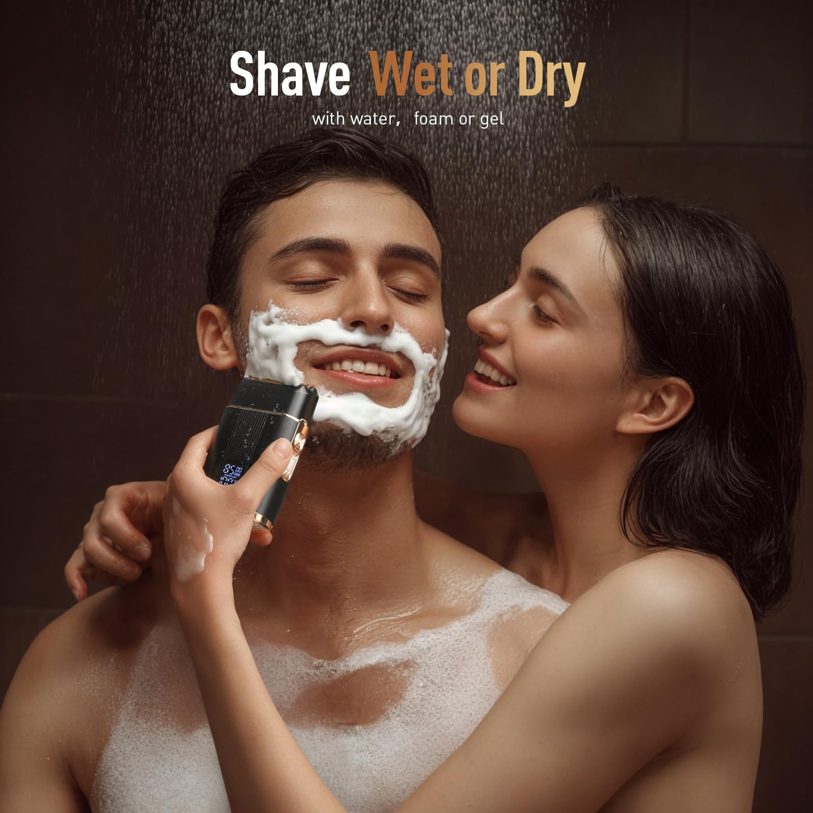 LED Display:For your convenience,our electric razor has a metal body with led display. The LED display accurately shows the battery level percentage and provides a low battery indication. Press and hold the electric shaver on/off button for 3 seconds to trigger a trip lock to avoid extra power consumption.