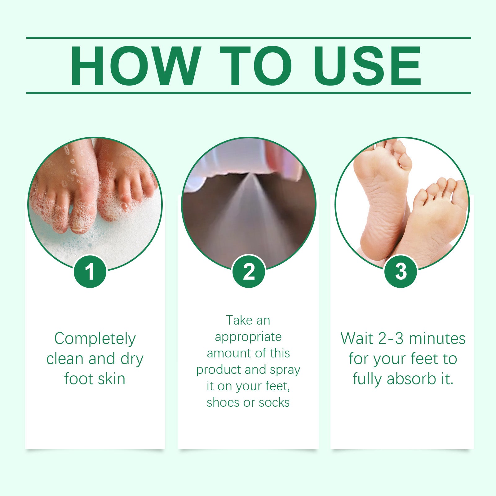 Our foot care agents include tea tree oil, Phellodendron extract, aloe vera leaf extract. It can have powerful antibacterial and anti-inflammatory properties. Relieve itchy feet caused by heat and humidity. Deeply nourish foot skin and repair damaged tissue. Its use method is very simple: 1. Thoroughly clean and dry the foot skin; 2. Take appropriate amount of this product and spray it on feet, shoes or socks; 3. Wait 2-3 minutes for your feet to fully absorb. Instantly break down odor molecules and freshen your feet. Effectively kill a variety of fungi and bacteria, protect the health of the foot.