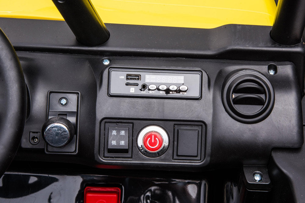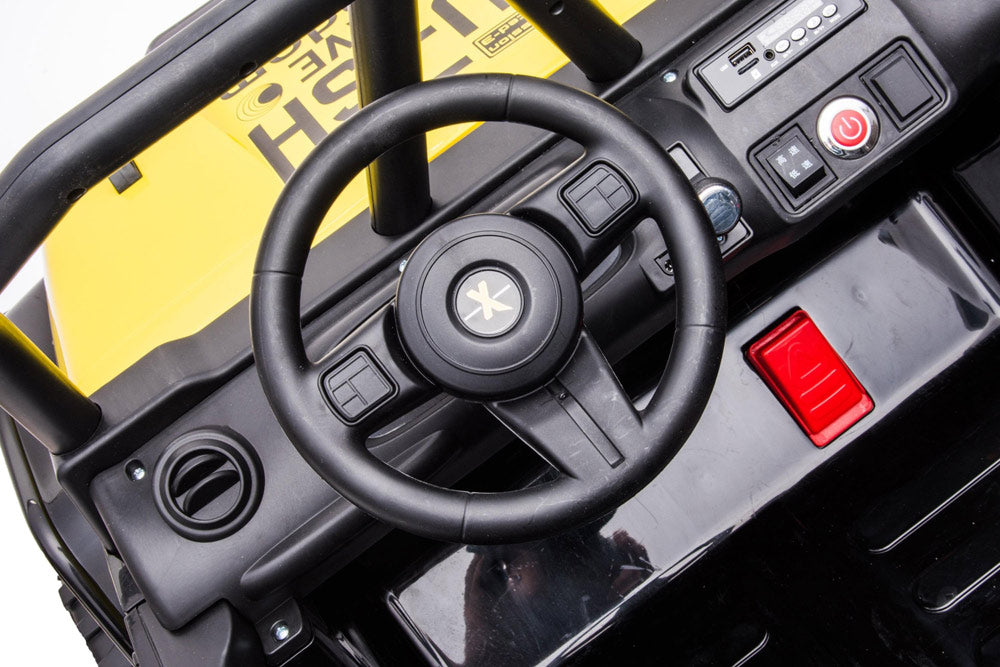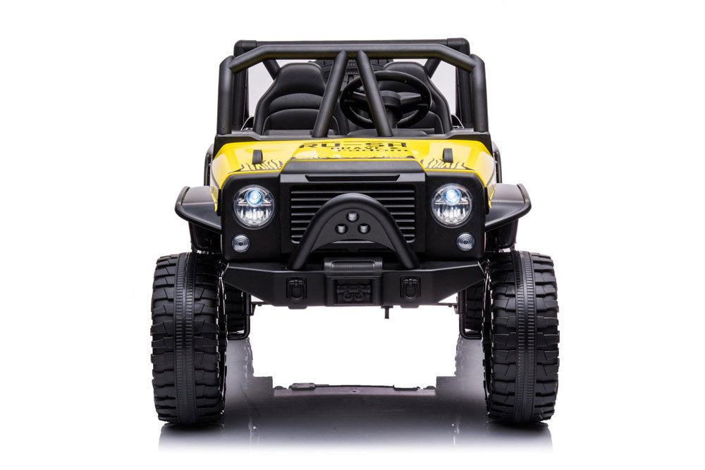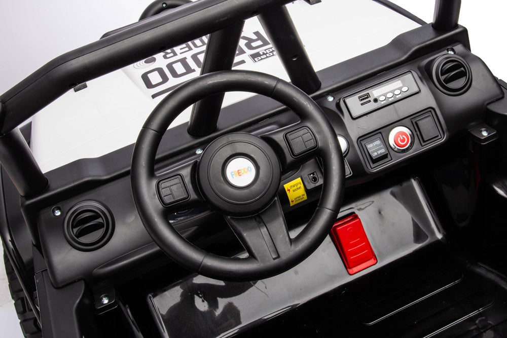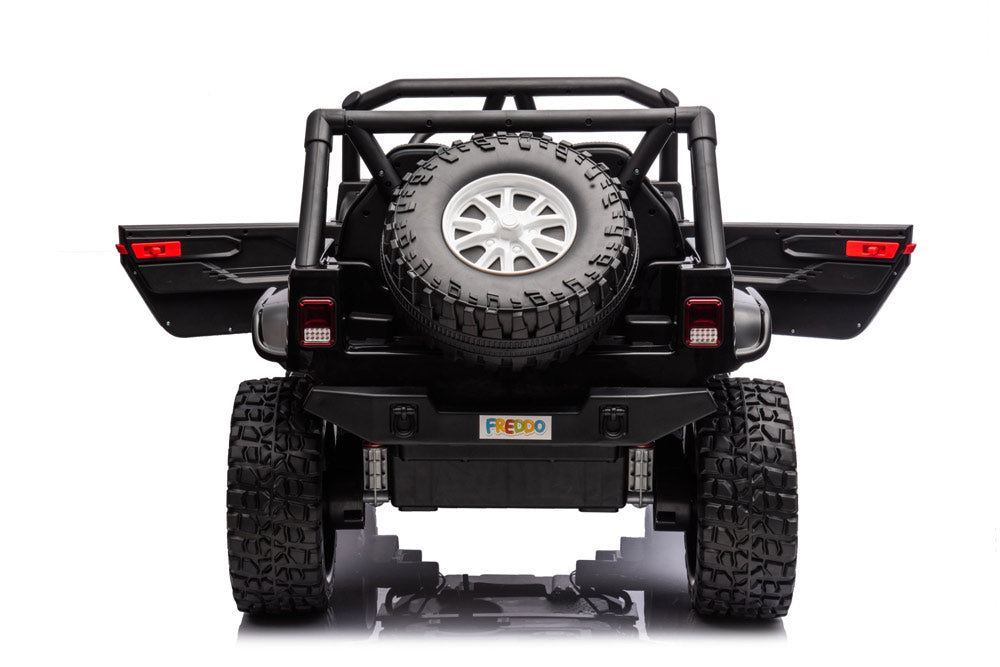 The long-awaited new Jeep has arrived! This complete and powerful ride-on electric go kart from Freddo Toys features two leather seats, remote control, music player, and LED lights. With its bold design and pull bar, it stands out from the crowd. Suitable for children aged 3-8, it can support up to 110 lbs. Get ready for action! This is truly an all-terrain vehicle.
