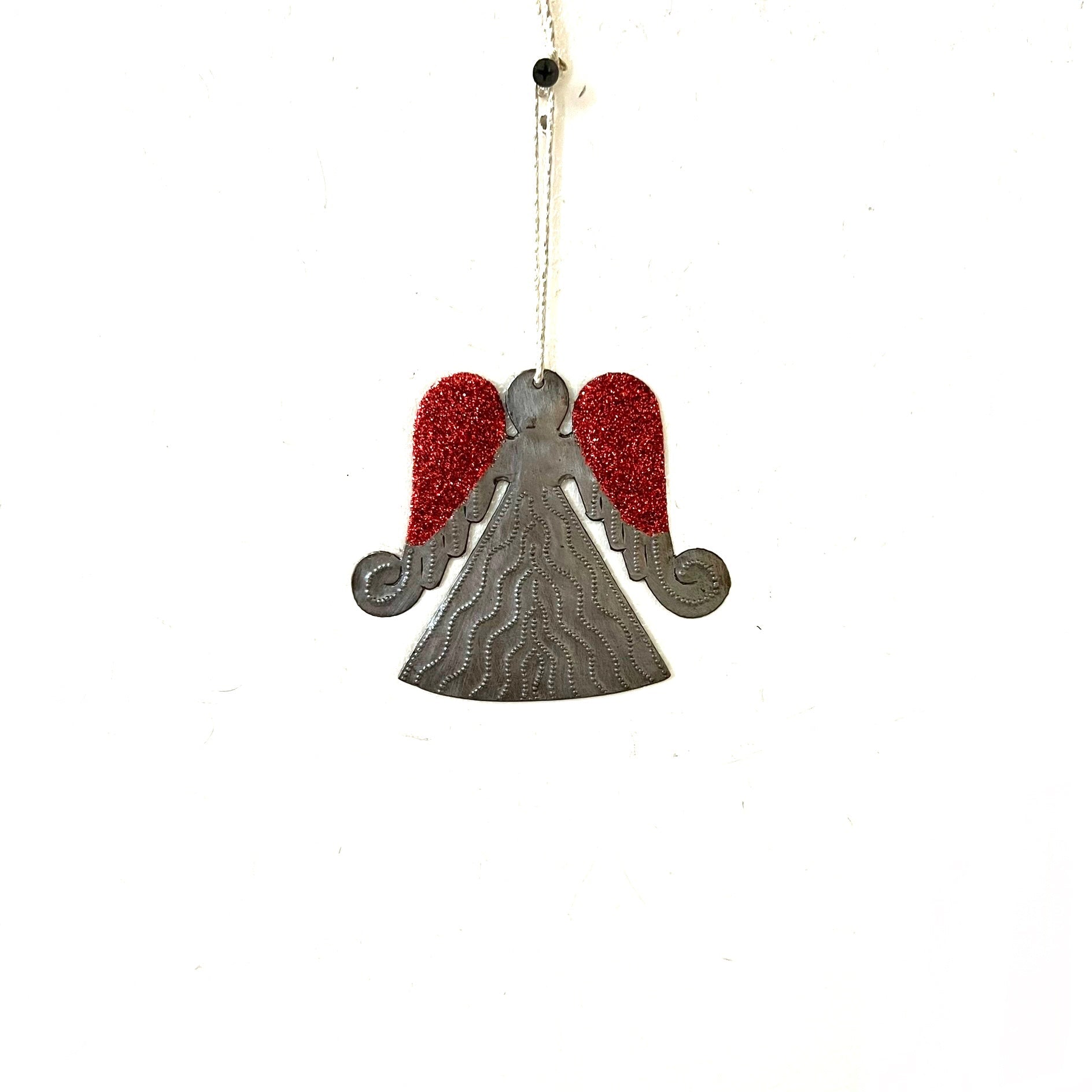 Hand made steel drum whimsical angel ornament with hand made paper bead on a string.