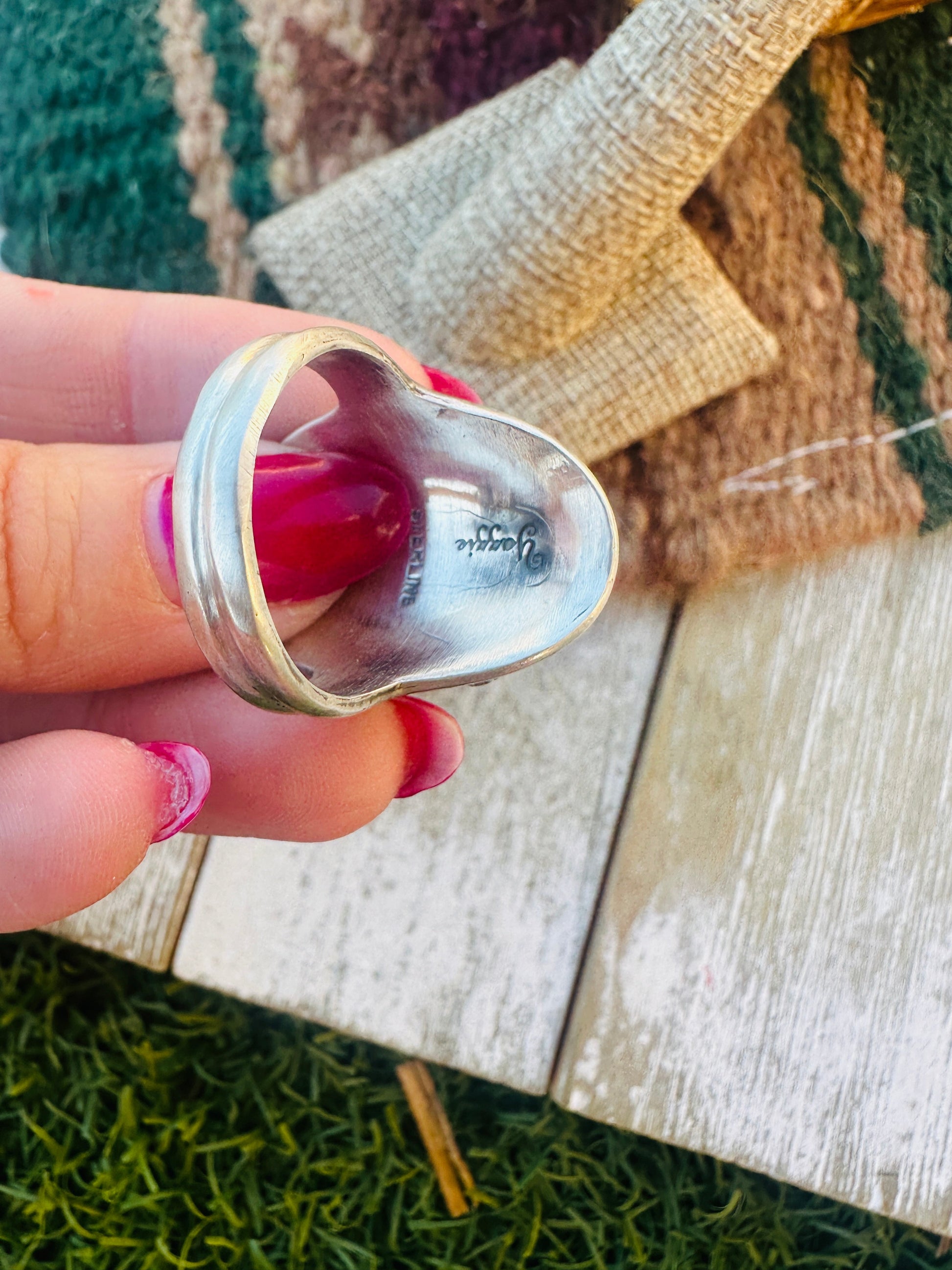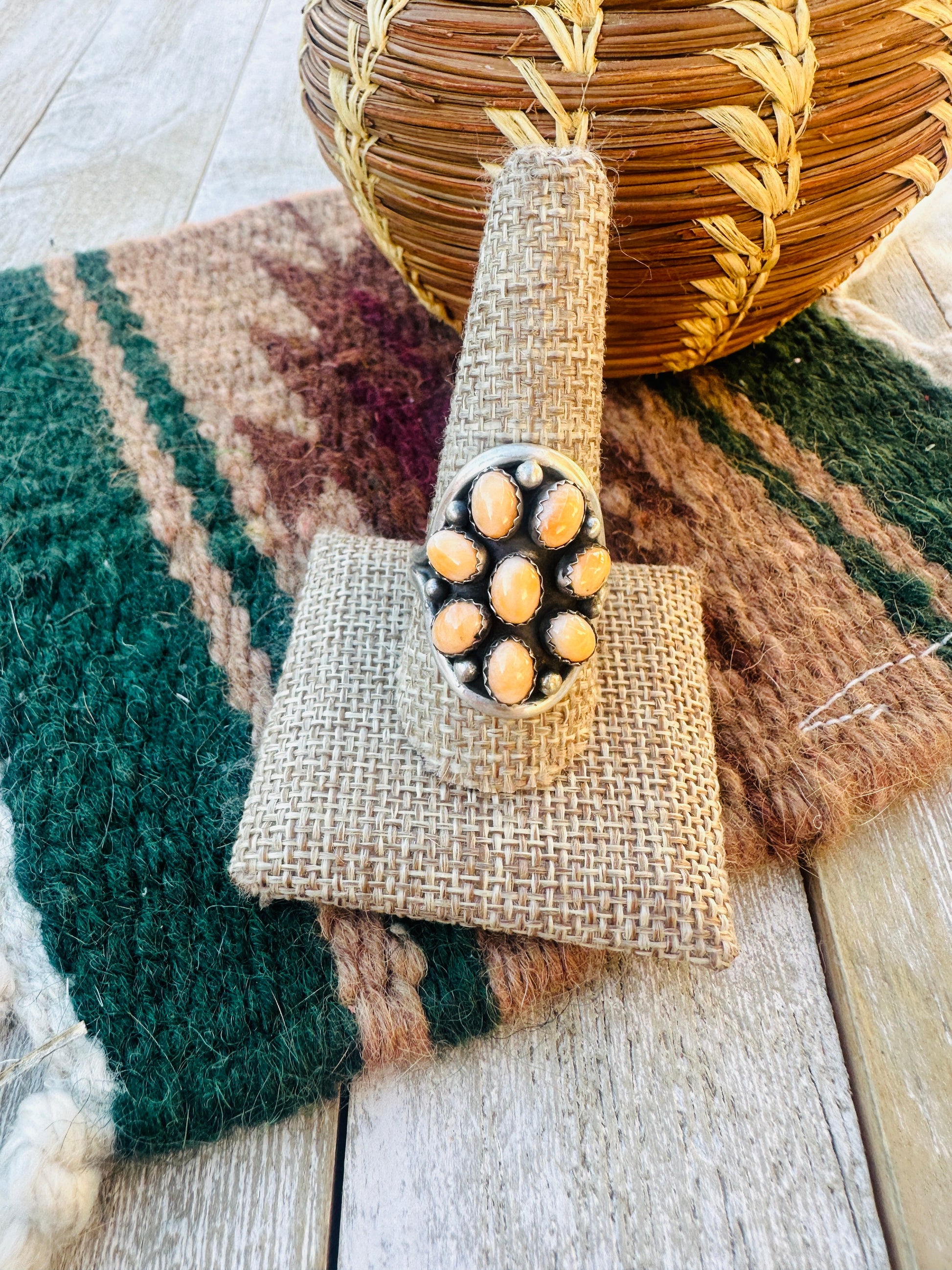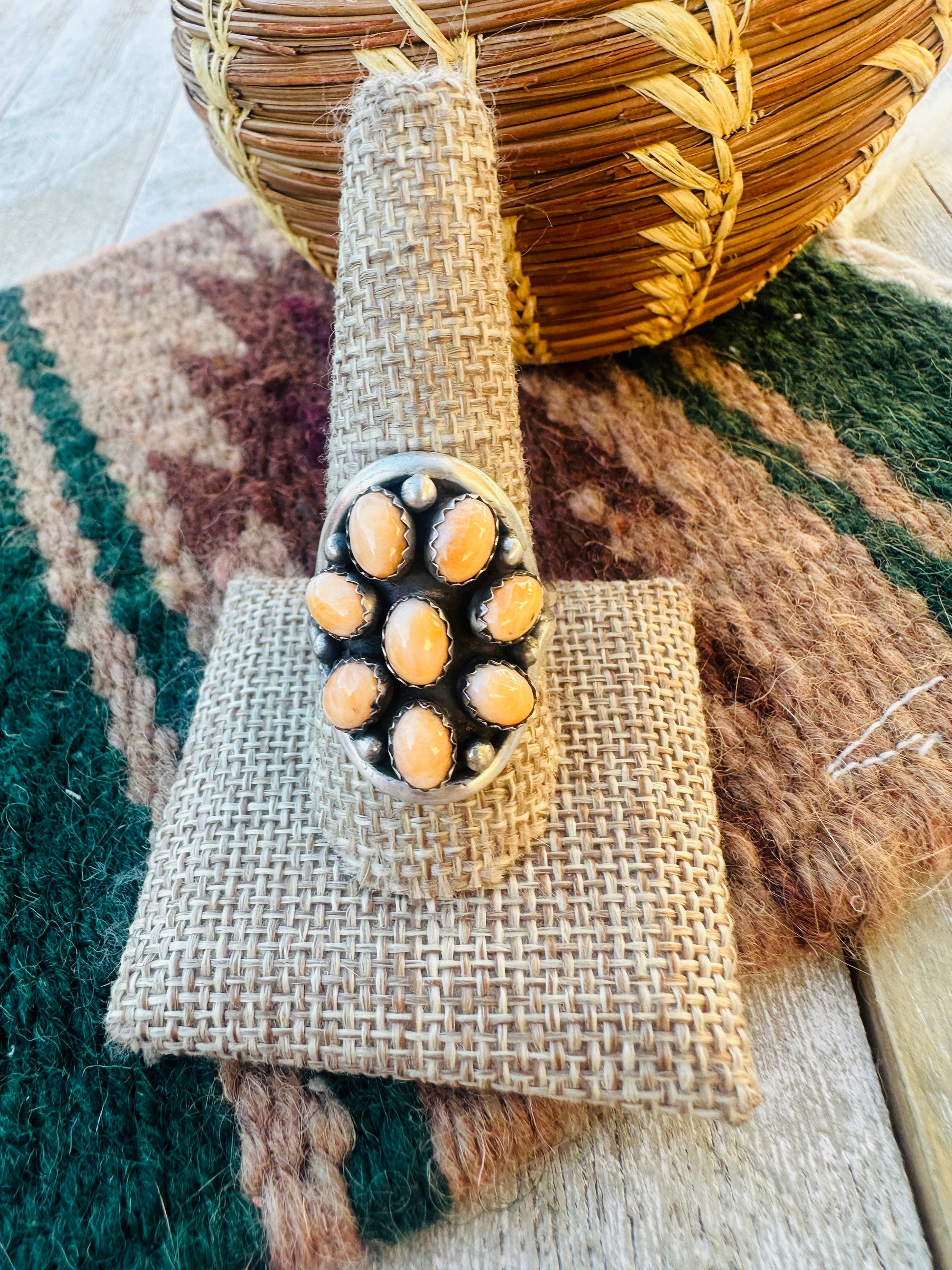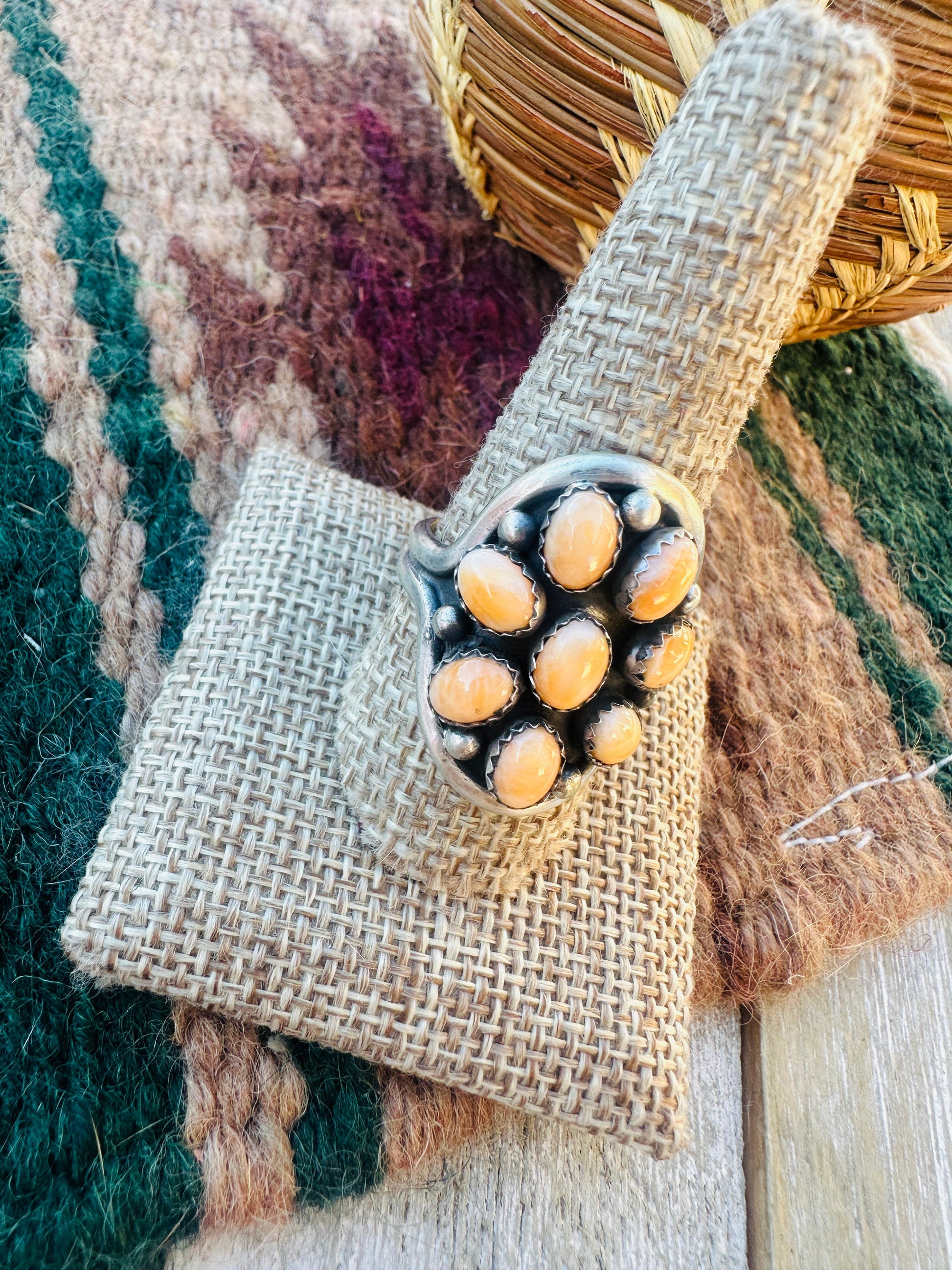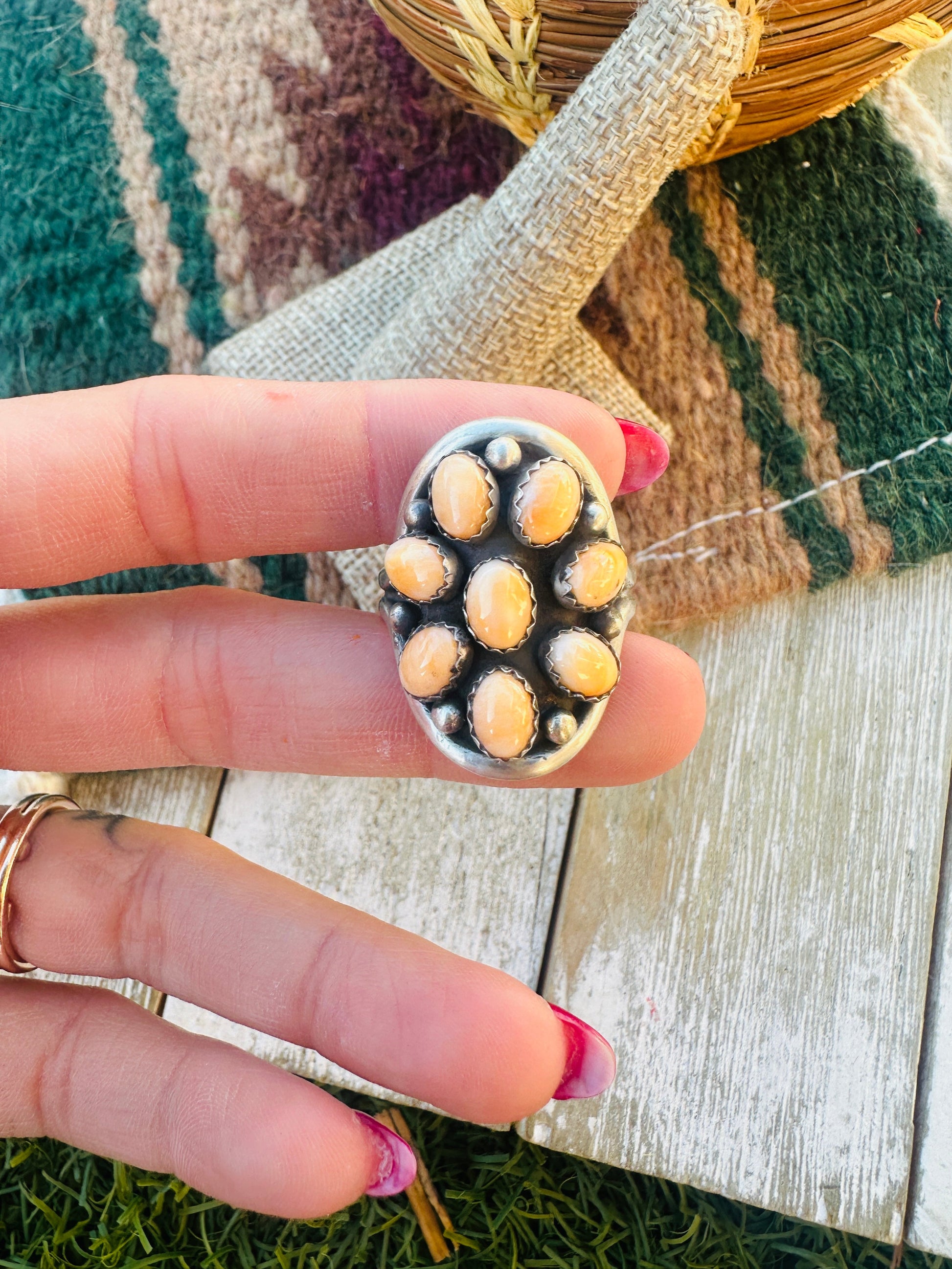 Beautiful Handcrafted Sterling Silver and Orange Spiny Oyster Shell Cluster Ring. Size 10.5. Measures 1 1/4 inches wide. Signed by the artist and stamped Sterling.