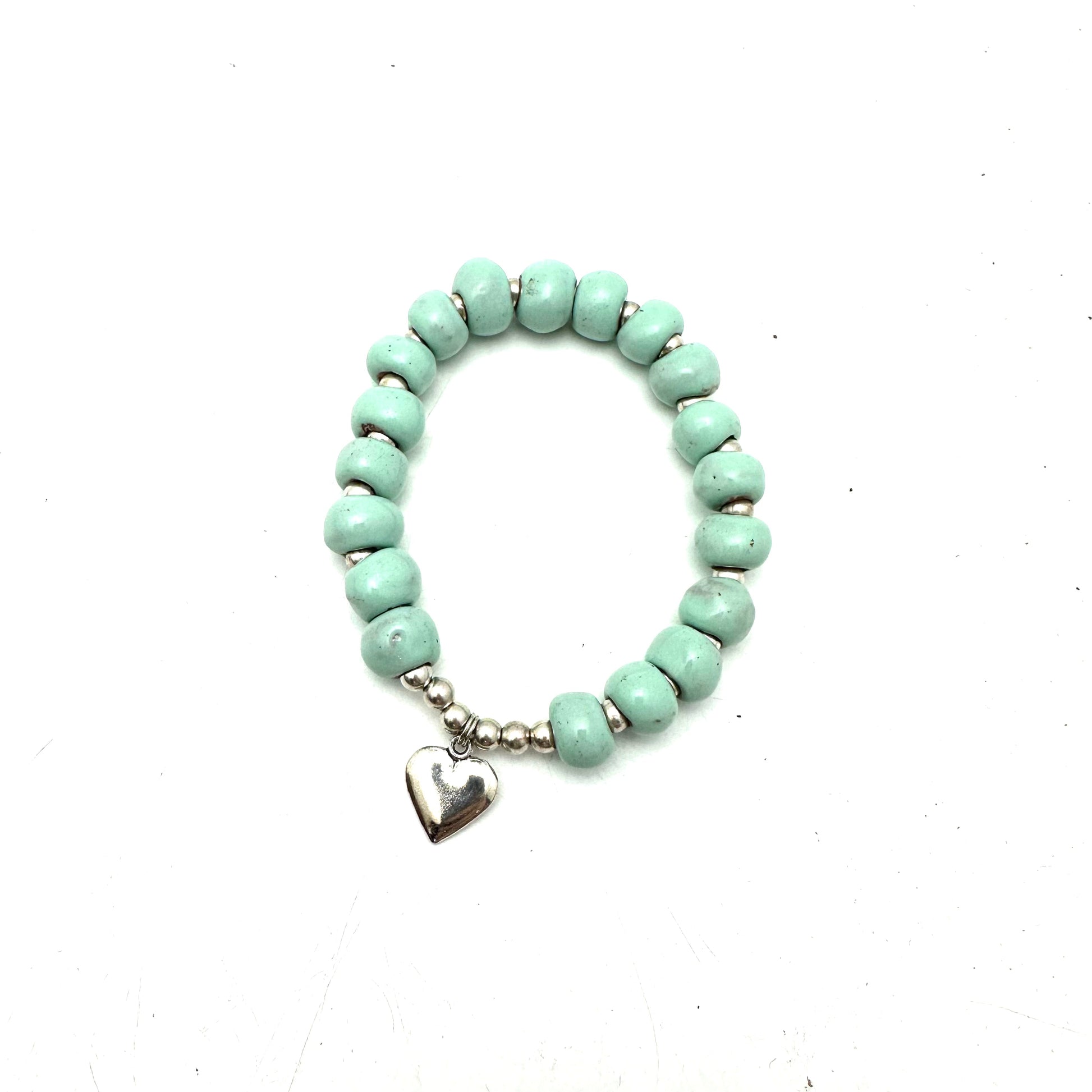 Handmade Haitian clay beads are fired with beautiful bright glaze colors. A sweet charm is added for detail