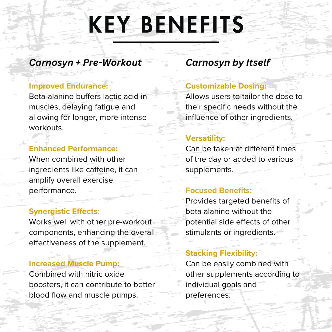 CarnoSyn® is a patented form of beta-alanine, a naturally occurring amino acid that plays a crucial role in the synthesis of muscle carnosine. Carnosine acts as a buffer against the pH decline in muscles, which can lead to fatigue and muscle failure during intense exercise. By elevating muscle carnosine levels, CarnoSyn® helps delay the onset of muscle fatigue, thereby extending endurance, improving recovery times, and enhancing overall peak performance.