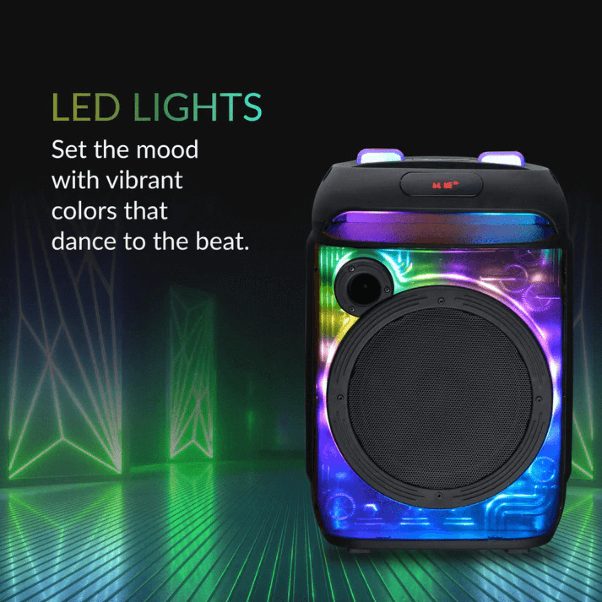 This versatile IQ Sound Cyber Flex8 speaker system is perfect for nightclubs, home entertainment, seminars, and any other event, delivering 40W RMS power. Equipped with Bluetooth 5.3 and True Wireless Stereo (TWS) technology, you can pair two speakers for double the output, while USB, Micro SD, AUX, and FM radio inputs provide flexible playback options. The top control panel allows easy adjustment of settings, and the system includes two built-in microphone inputs, a remote control, and a wireless microphone for karaoke, announcements, or live events. A dazzling LED light show enhances the atmosphere, and a pole-socket (tripod not included) adds mounting flexibility. Powered by a 3000mAh rechargeable battery, it provides up to 6 hours of playtime, making this all-in-one system portable, powerful, and ready for any occasion.