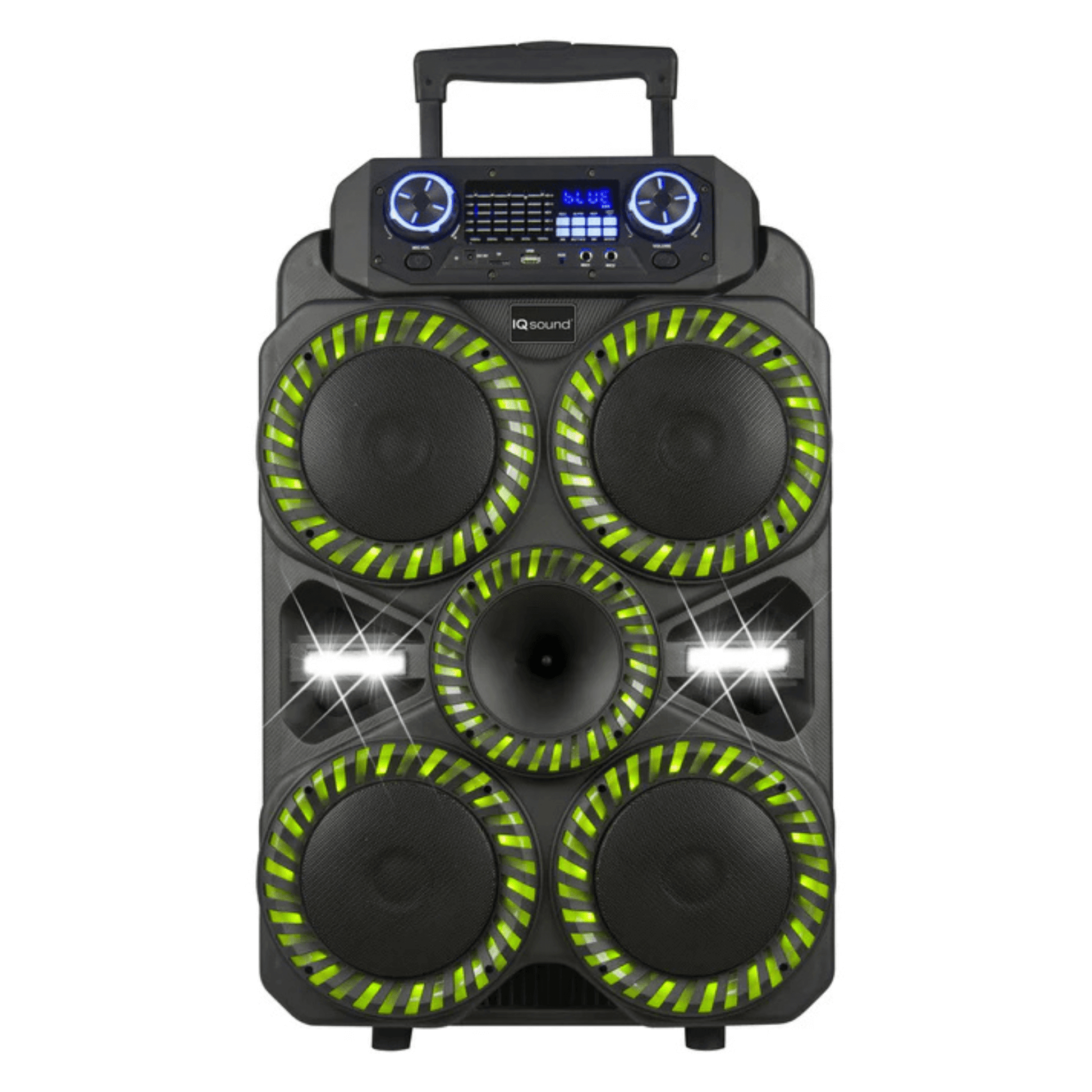 This powerful IQ Sound Speaker System is perfect for nightclubs, home entertainment, seminars, and events, delivering 40W RMS output through four 8" woofers and a 1.5" tweeter with a wide 45Hz-20KHz frequency response. Equipped with Bluetooth 5.1 with a 10m range and True Wireless Stereo (TWS) technology, it allows you to pair two speakers for doubled audio output, while built-in USB, Micro SD, AUX, and FM radio provide versatile playback options. A top-front control panel makes operation simple, and the system includes two microphone inputs along with one wired and one wireless microphone, plus a recording function for added convenience. The dynamic LED light show enhances the atmosphere, and the pole socket allows for tripod mounting (tripod not included). Designed for portability, it features a built-in trolley with a retractable handle and two wheels, powered by a 4000mAh rechargeable battery that delivers up to 4 hours of playtime on DC9V input. Accessories include a remote control for easy operation, making this an all-in-one solution for powerful, portable sound.