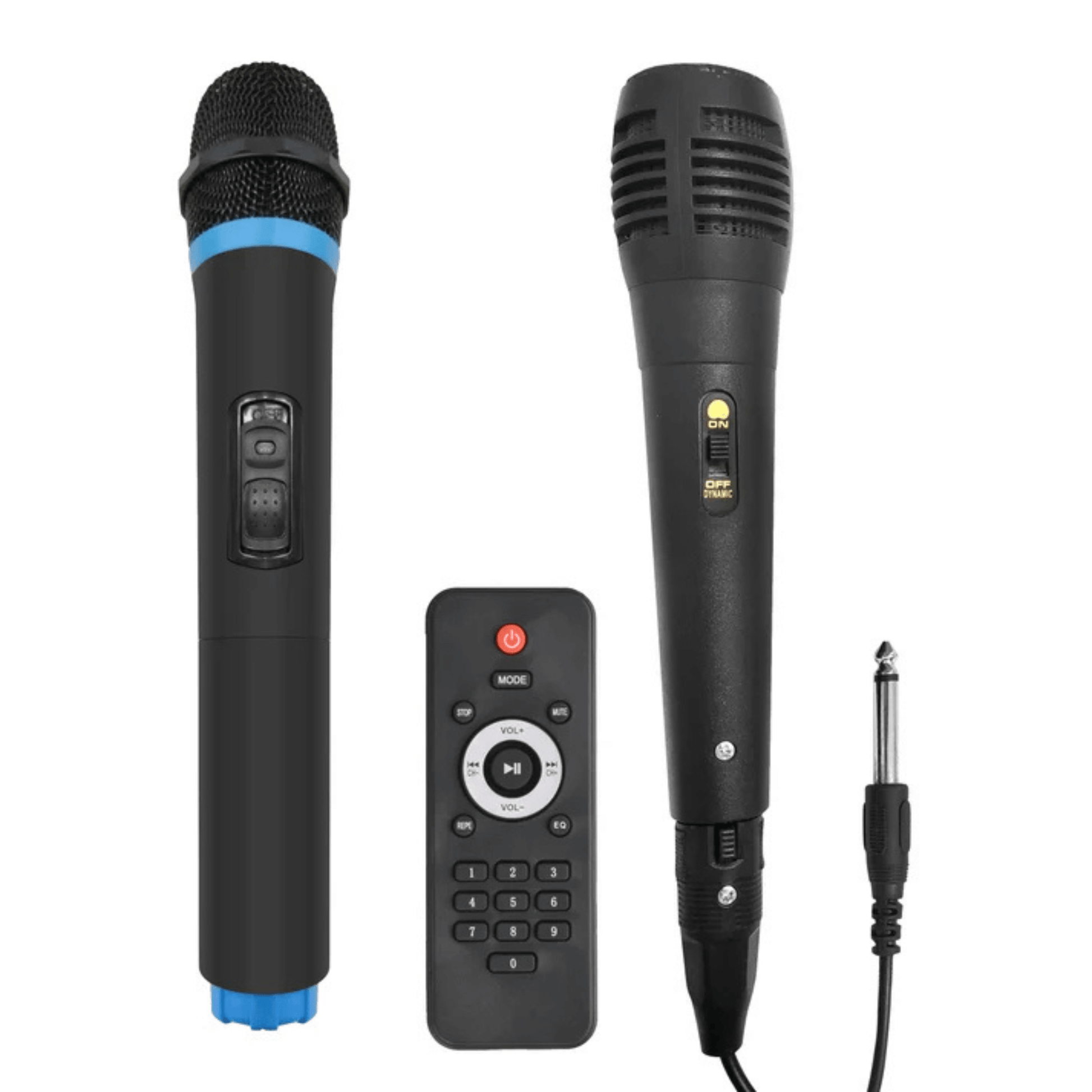 Accessories: Manual, AUX Cable (113cm), Wireless and Wired (240cm) Microphones, Remote Control, DC 9v Power Adapter (153cm)