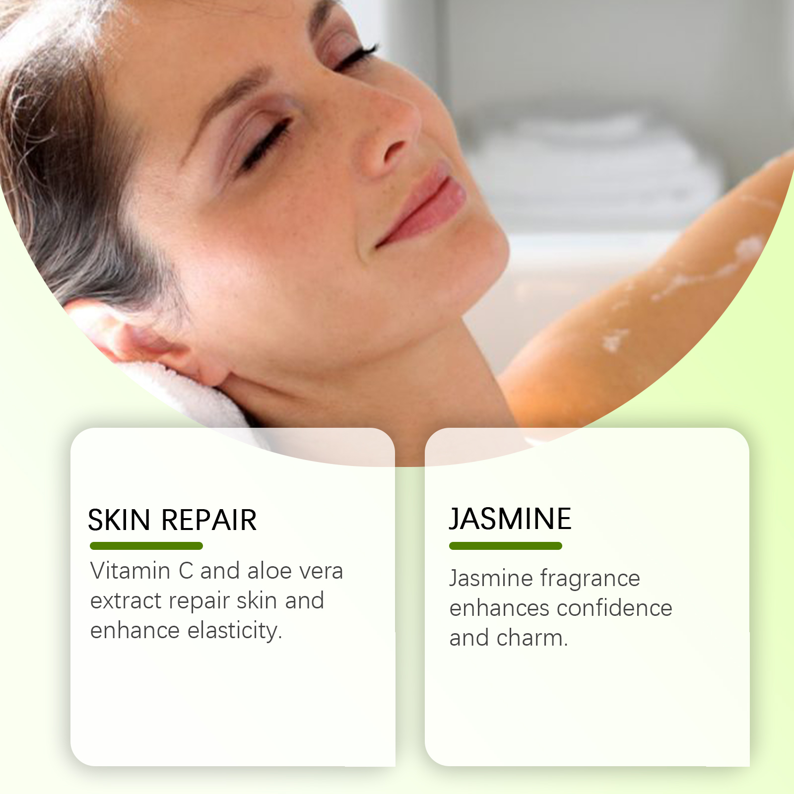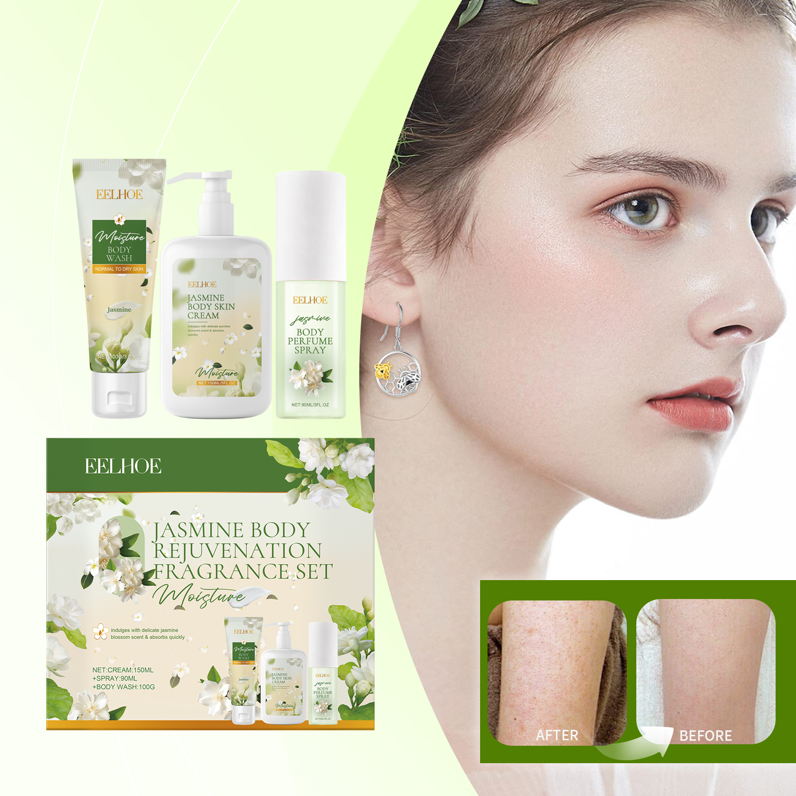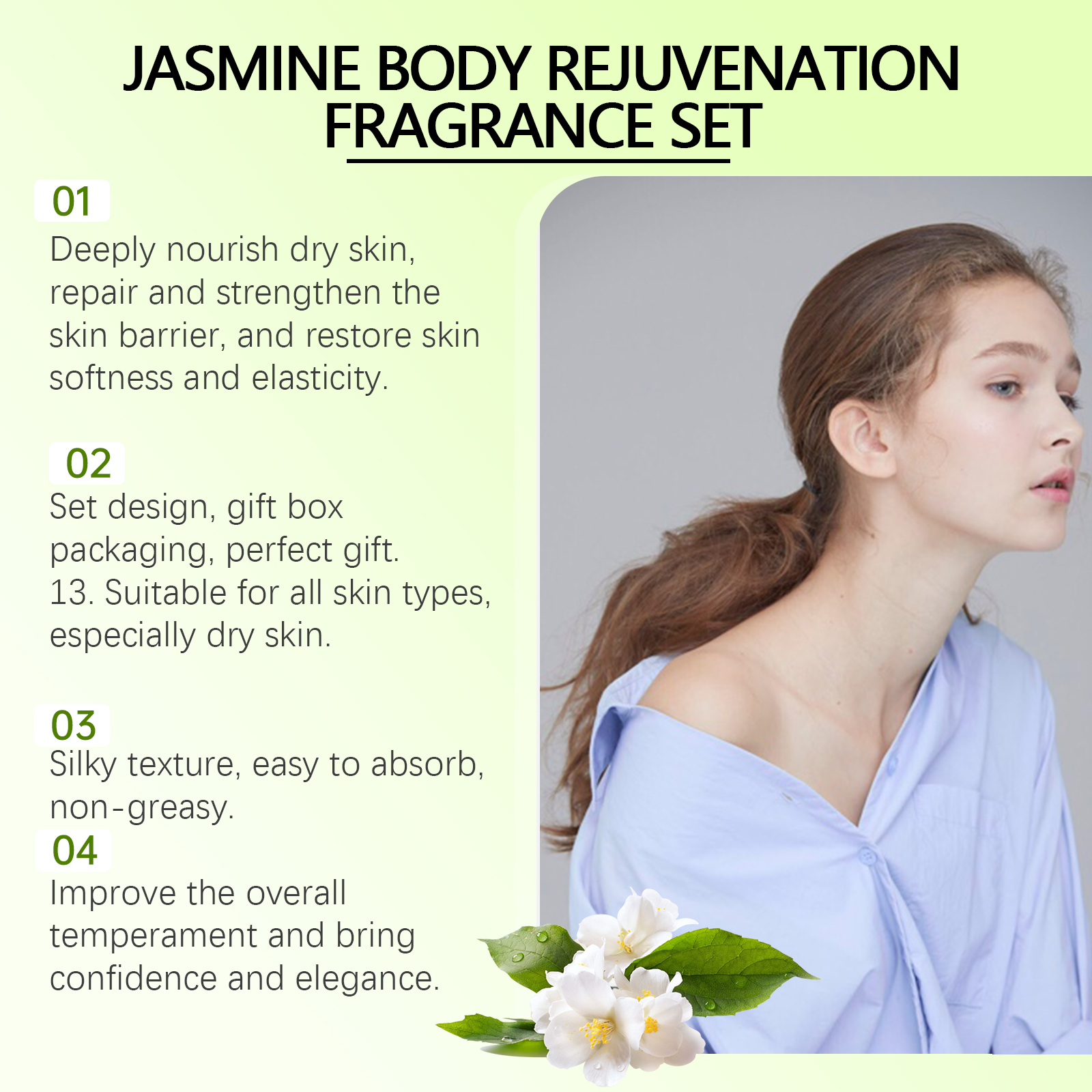 Our Jasmine Body skincare set contains jasmine extract, aloe vera leaf extract, ascorbic acid. It can deeply moisturize the skin and keep it moist; Effectively cleans and protects the skin barrier; Bring long-lasting fragrance and enhance the overall temperament. Its use is simple: shower gel: 1. Clean and dry skin; 2. Take proper amount of body wash, rub into foam, and evenly apply to the whole body; 3. Gently massage until completely clean and finally rinse with water. Body lotion: 1. Cleanse and dry skin; 2. Apply proper amount of the product evenly to the whole body; 3. Gently massage until absorbed. Perfume spray: 1. Cleanse and dry body skin. 2. Open the lid, press down on the pump head, and spray the appropriate amount of spray on the body. Vitamin C and aloe vera extract repair skin and enhance elasticity; Jasmine scent enhances confidence and charm.
