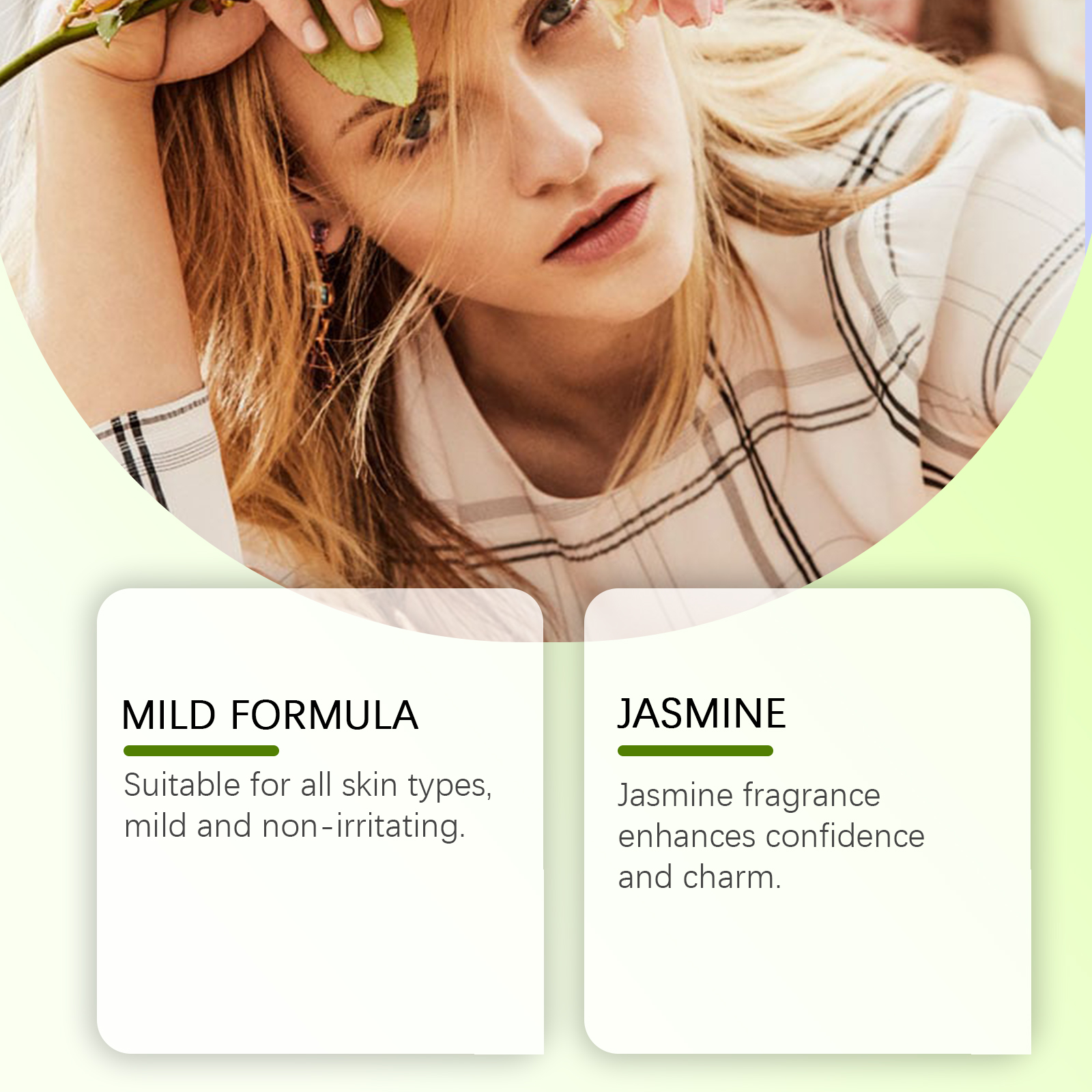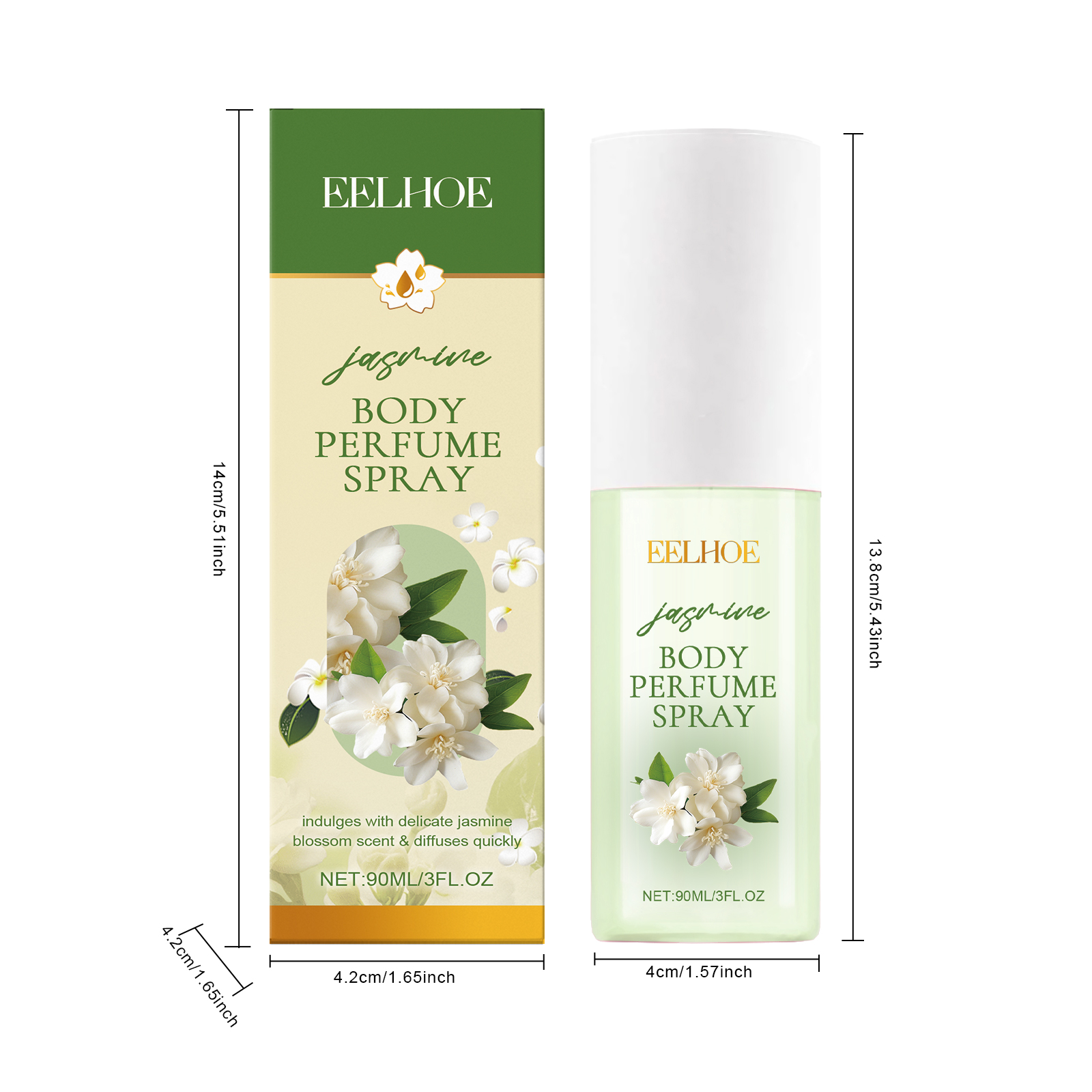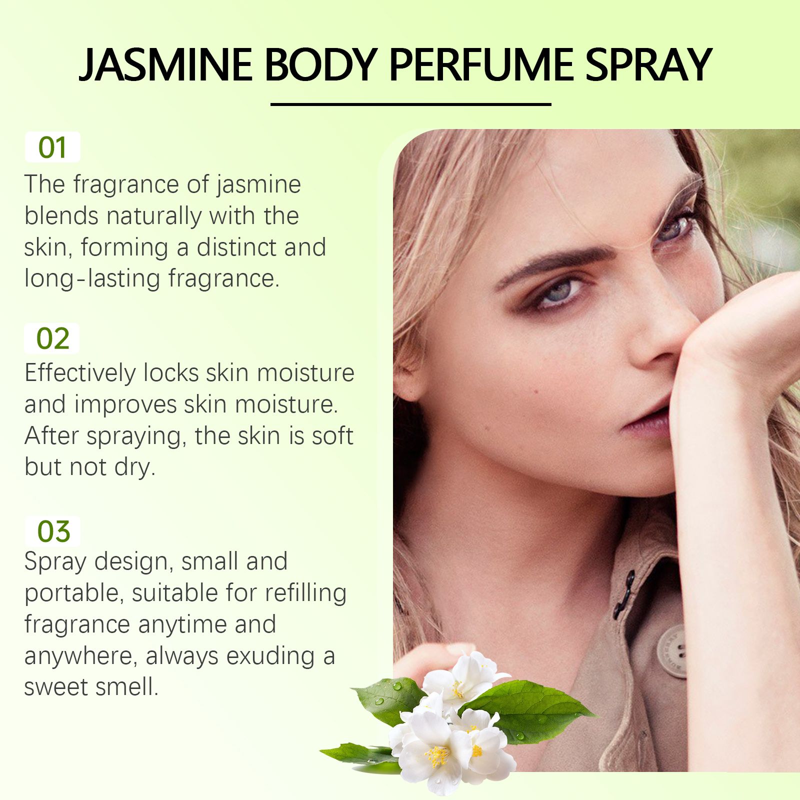 Our Jasmine Body Perfume spray contains vitamin C and aloe vera extract. It can be replenished at any time and always gives off a sweet smell. The method of applying it is simple: clean and dry the skin of the body, open the lid, press the pump head, and spray the right amount of spray onto the body. It can also boost confidence and charisma
