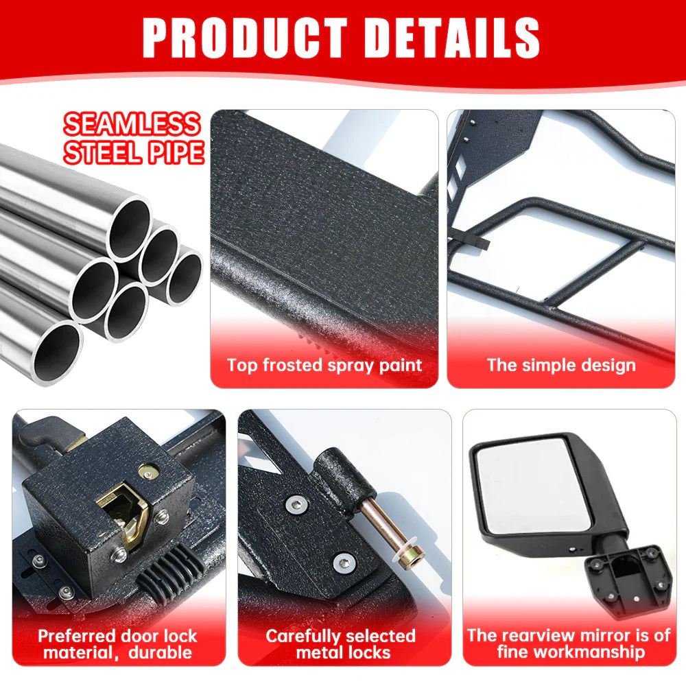 Compatibility: The Steel Tube Half Doors with Side View Mirror for 2018-2024 Jeep Wrangler JL JLU & Gladiator JT 4-Doors(Includes 4XE). They will not fit a Jeep Wrangler JK model.