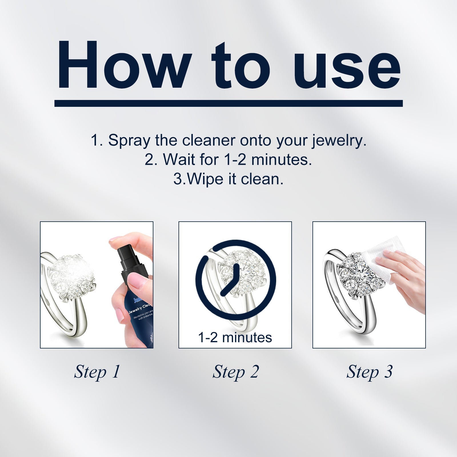 Our jewelry cleaners contain surfactants. It can make gold and silver jewelry whiter, clean, and has a strong cleaning effect. The way it works is simple:1. Spray the cleaner on the jewelry. 2. Wait 1-2 minutes. 3. Wipe clean. And it can deeply clean your jewelry without damaging it, while also forming a protective film that restores the shine of your jewelry.
