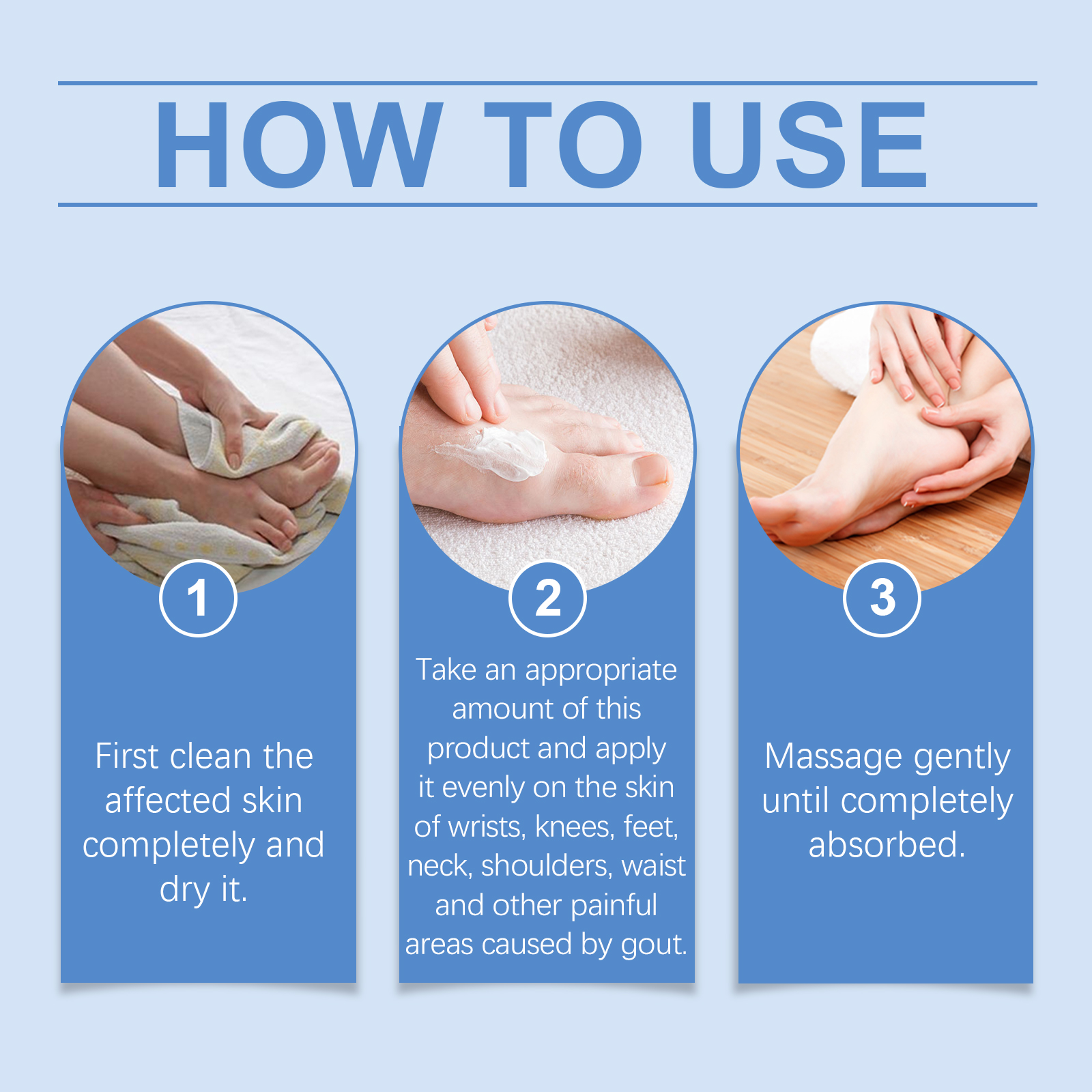 Our joint care ointment contains aconite root extract and frankincense extract. It can effectively reduce joint swelling and promote rapid recovery. Its application is simple: first thoroughly clean the affected skin and allow it to dry. Apply appropriate amount of this product evenly on the wrist, knee, foot, neck, shoulder, waist and other painful parts of the skin caused by gout. Massage gently until fully absorbed. It can also help restore joint health and improve mobility.