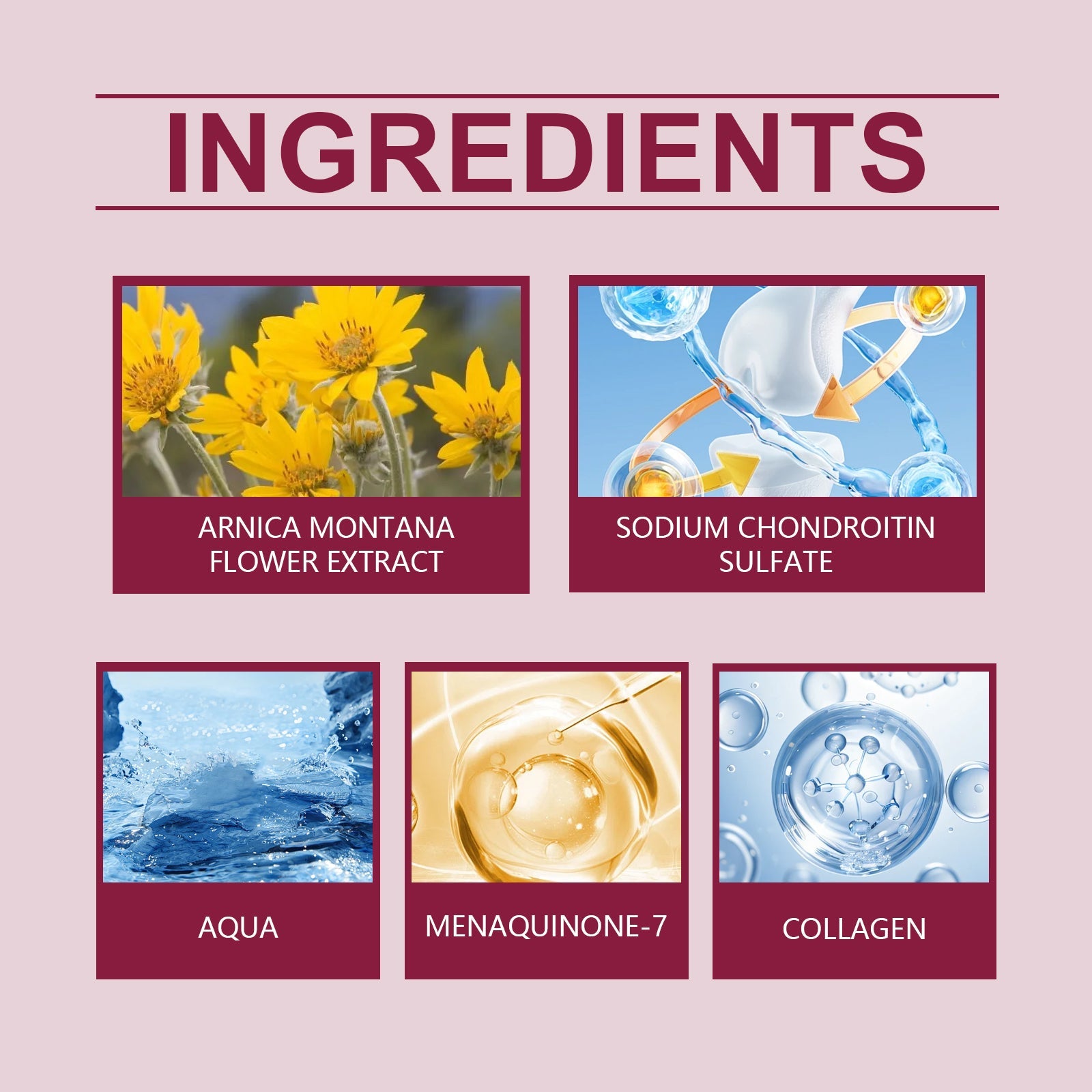 Our joint pain relief cream contains collagen, vitamin K2, Arnica flower extract. It can effectively relieve joint pain and discomfort, bringing instant comfort. Helps reduce joint stiffness and improve mobility. Its use is simple: 1. to clean and dry the affected skin; 2. Apply an appropriate amount of this product evenly to knee joint, shoulder, back joint pain and other bone and muscle pain parts; 3. Use your hands in a circular motion to gently massage and absorb. Joint pain relief cream promotes blood circulation and enhances the health of joints and surrounding tissues.