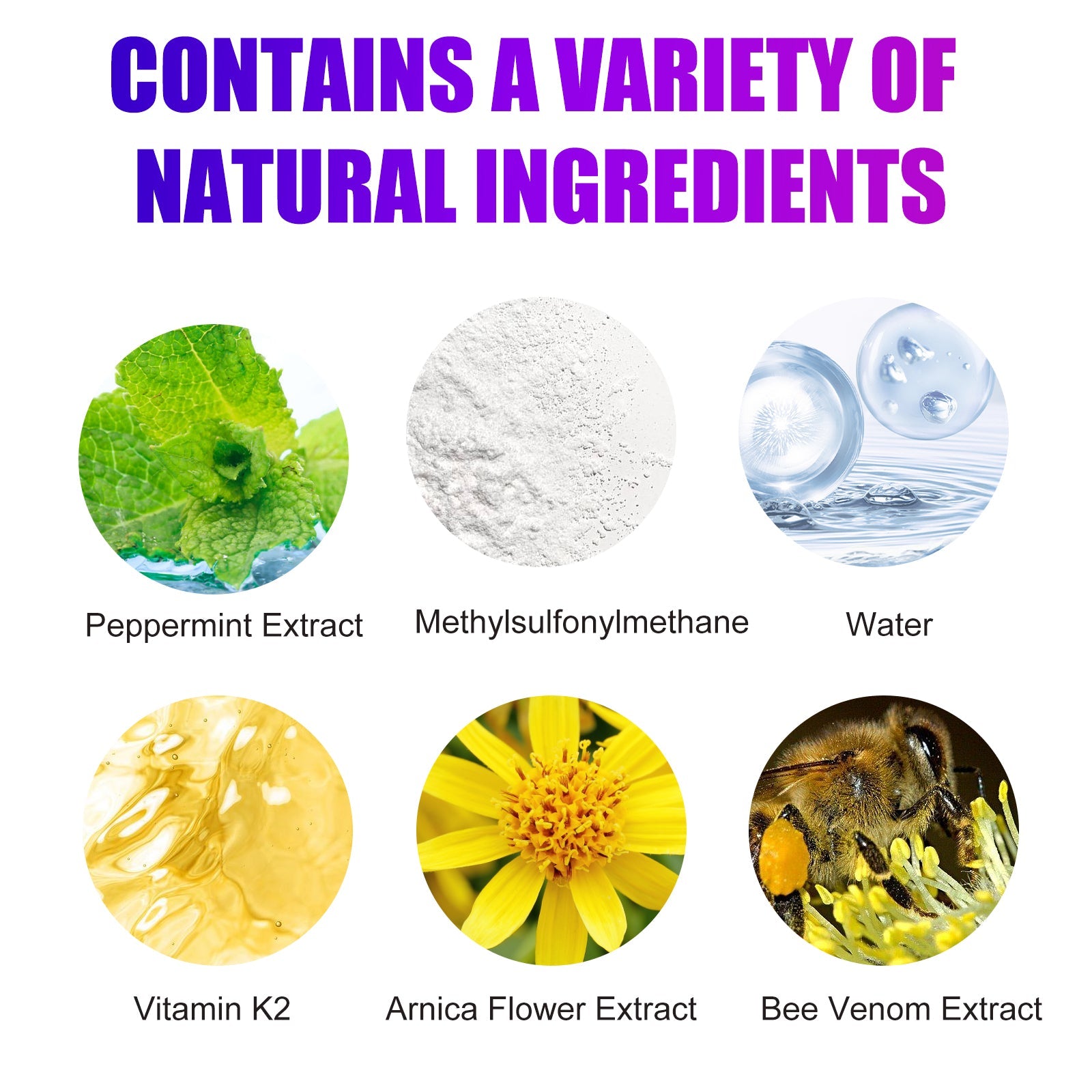 Our joint repair cream contains vitamin K2 and Arnica flower extract. It can relieve joint swelling and discomfort, improve joint flexibility and mobility, and make daily activities easier. Its use method is very simple: 1. Clean and dry the skin of the joint. 2. Take appropriate amount of cream and spread it evenly on joints. 3. Gently massage with your hands in circular motions and let it absorb for about 15 minutes. 4. Use 2-3 times a day for better results. It can also promote calcium absorption, accelerate the normal repair of connective tissue, restore the normal shape of joints, and enhance bone health.