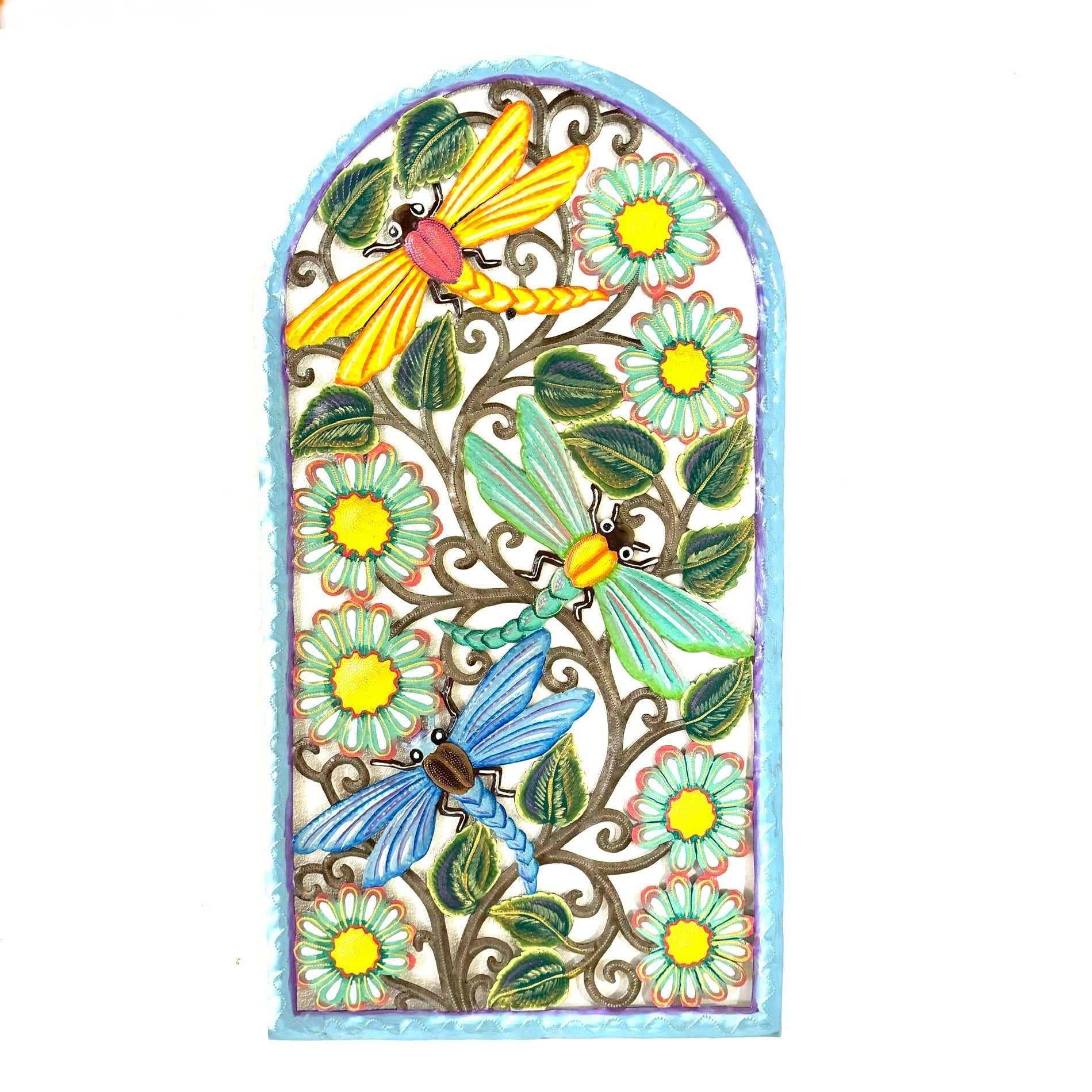 One of the most celebrated Haitian art forms, steel drum art is always a winner! Each piece is hand crafted from recycled 55 gallon drums using only a hammer and a few small tools that resemble railroad spikes. Each piece is a true work of art!